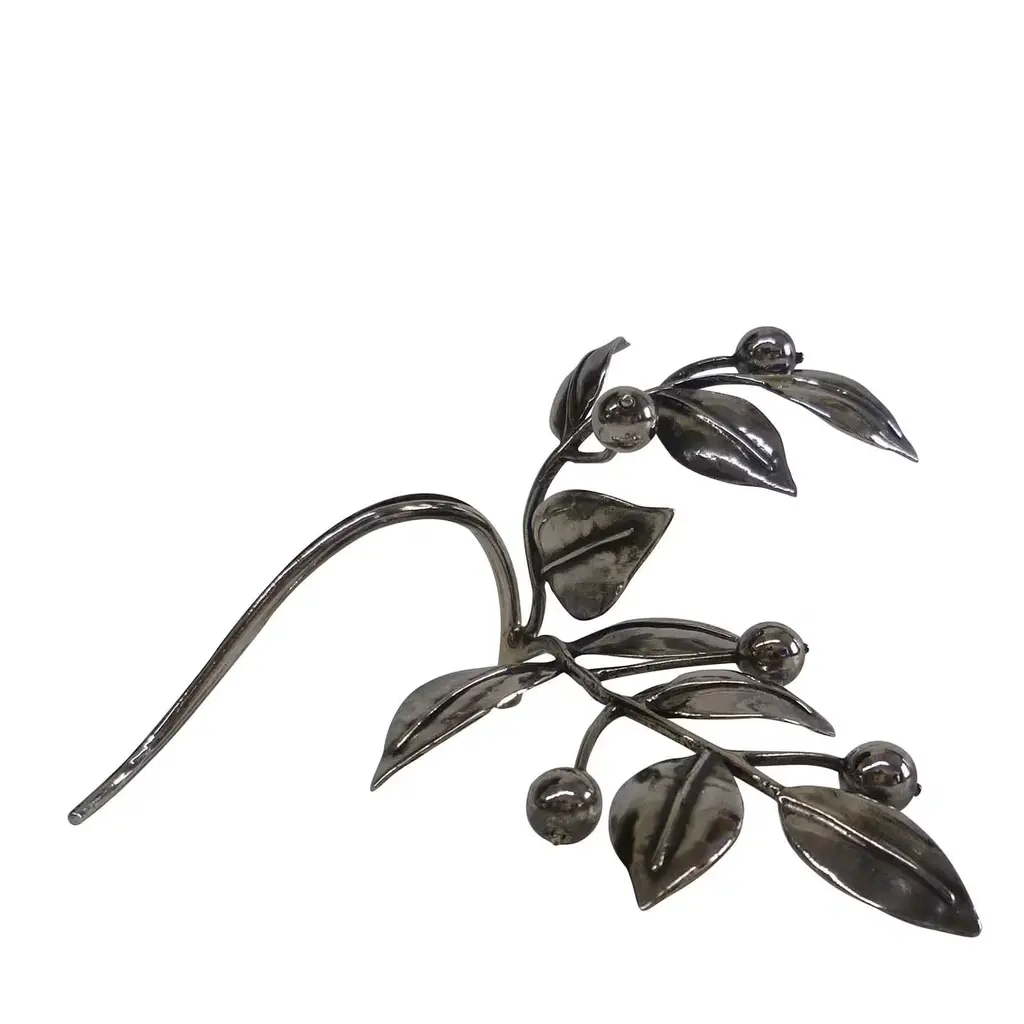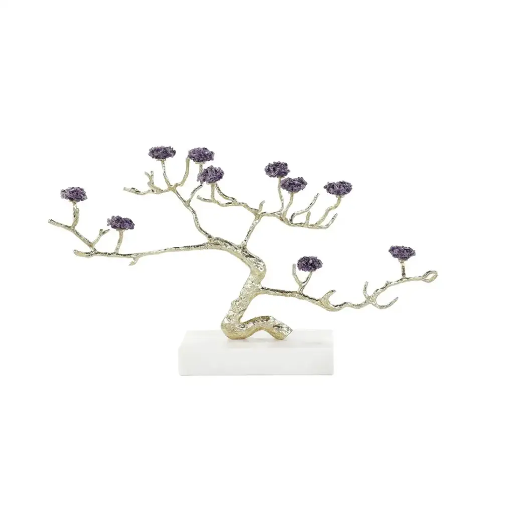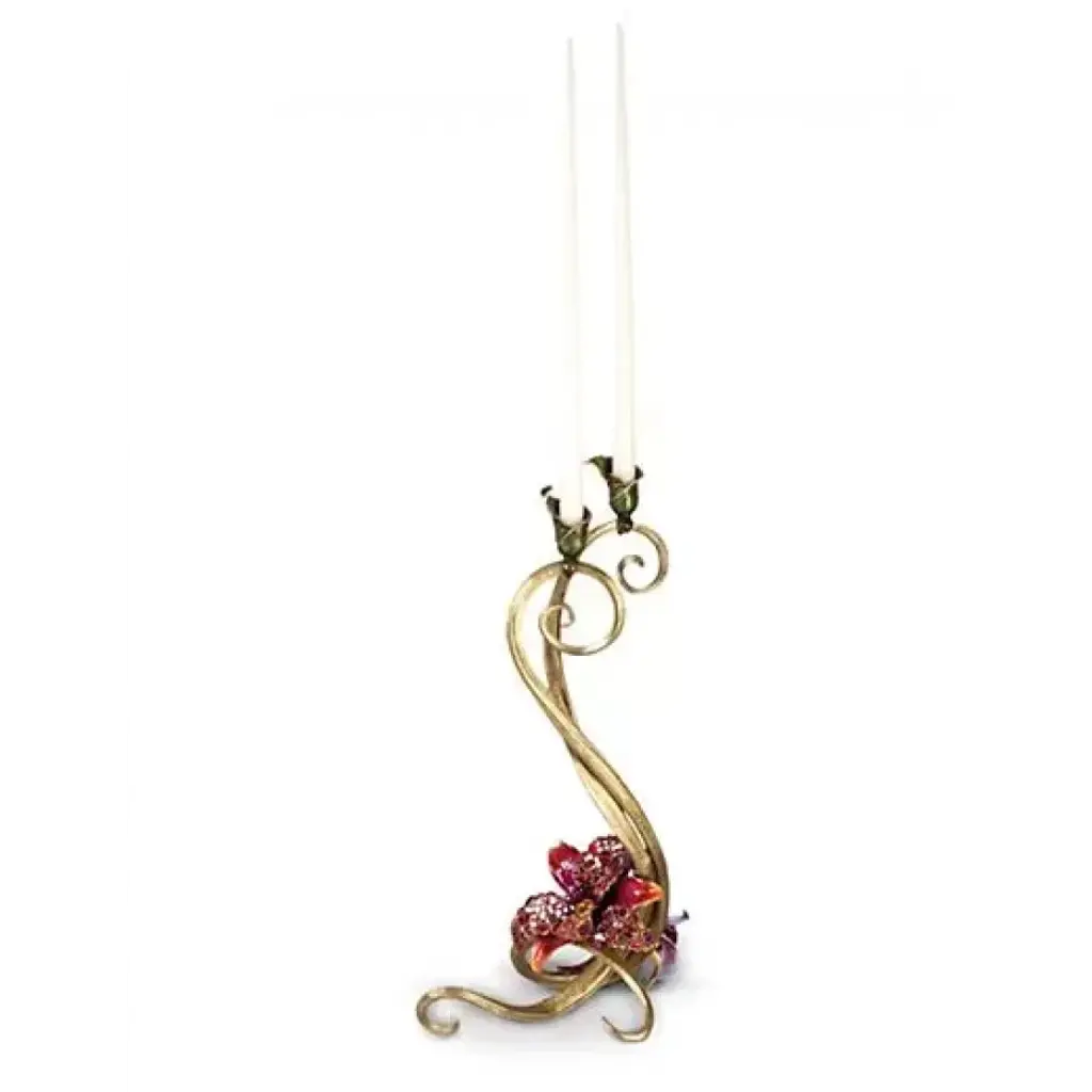 A striking contour of nouveau-style scrolled brass rises from the table, holding leaf-shaped candle cups. At the base of our Roselyn Orchid Double Candlestick, lush orchids are fully bloomed in hothouse-toned enamels and set with vibrant faceted crystals and stones. Beautiful displayed as a pair or individually.