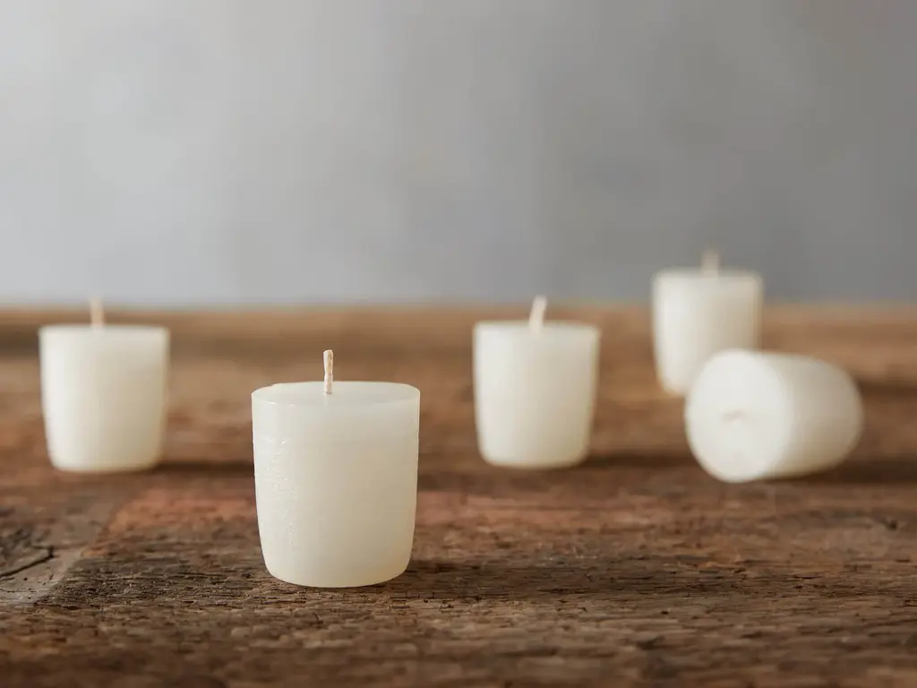 Our Rustic Candle Collection is hand-poured using fully refined paraffin wax and 100 percent cotton wicks. Special distressed finishes result in a refined, rustic look that will complement your décor with warm Arhaus charm. These candles burn slowly and are clean burning for hours of ambiance. Set of 48 votive candles. Made of food-grade paraffin wax. Cotton wick. Imported.