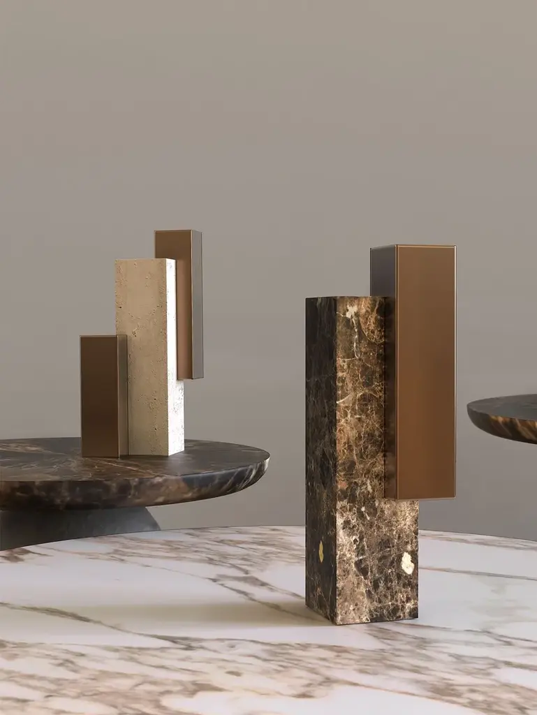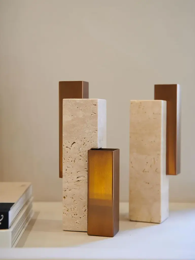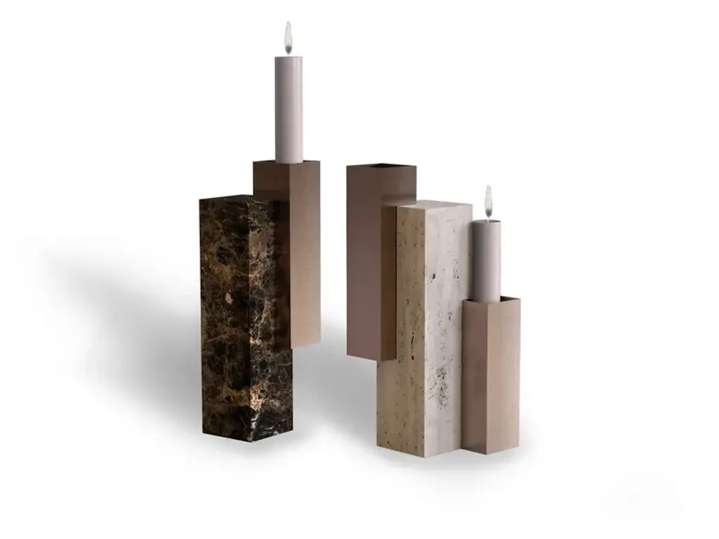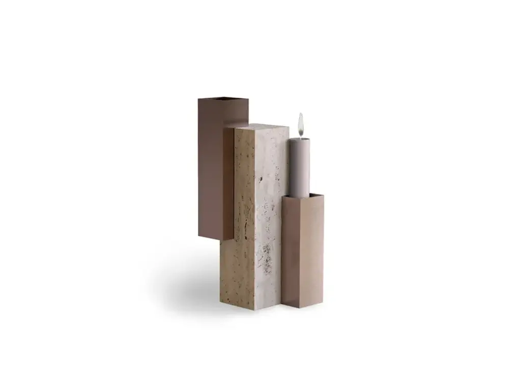 Sabina is a candleholder or candlestick that is characterized by a marble rectangular base to which the metal parts that act as candleholders are set. Sabina is available in Dark Emperador marble and bronze metal or in Travertine marble and bronze metal.