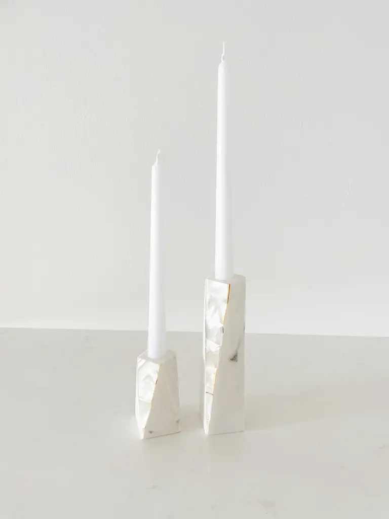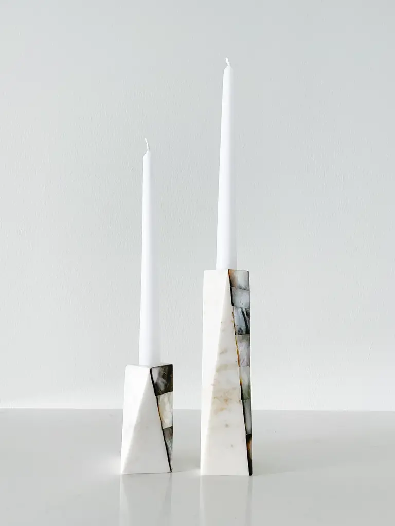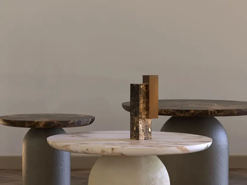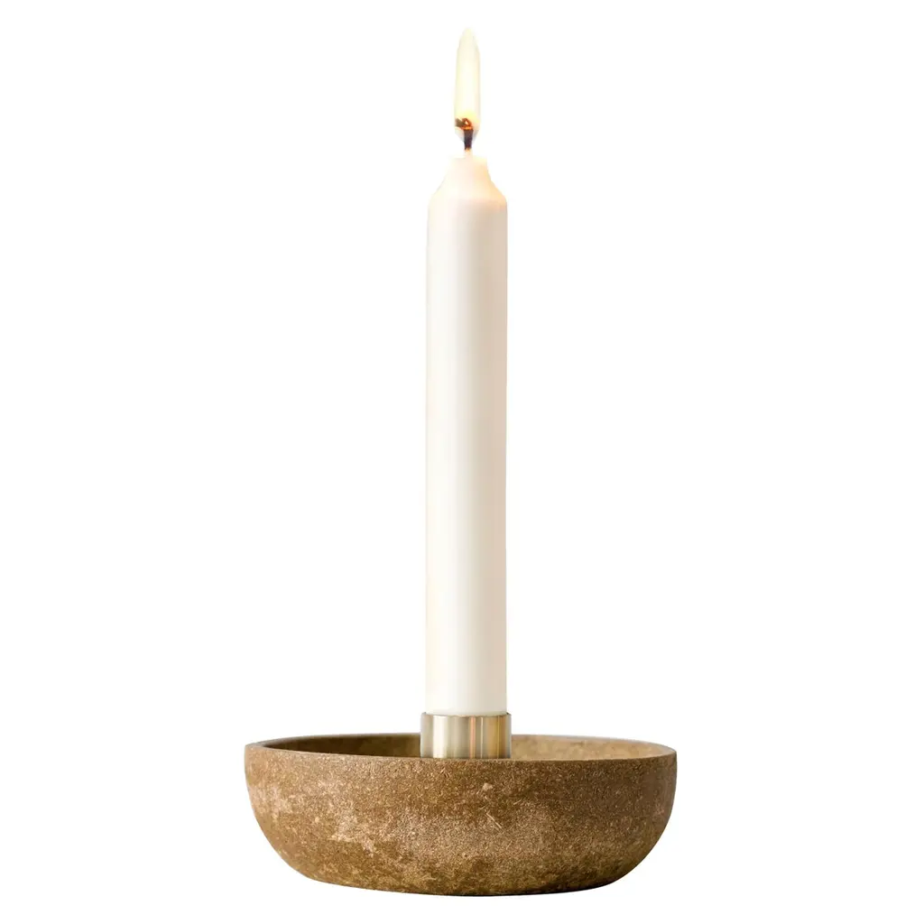 Sabina is a candleholder or candlestick that is characterized by a marble rectangular base to which the metal parts that act as candleholders are set. Sabina is available in Dark Emperador marble and bronze metal or in Travertine marble and bronze metal.