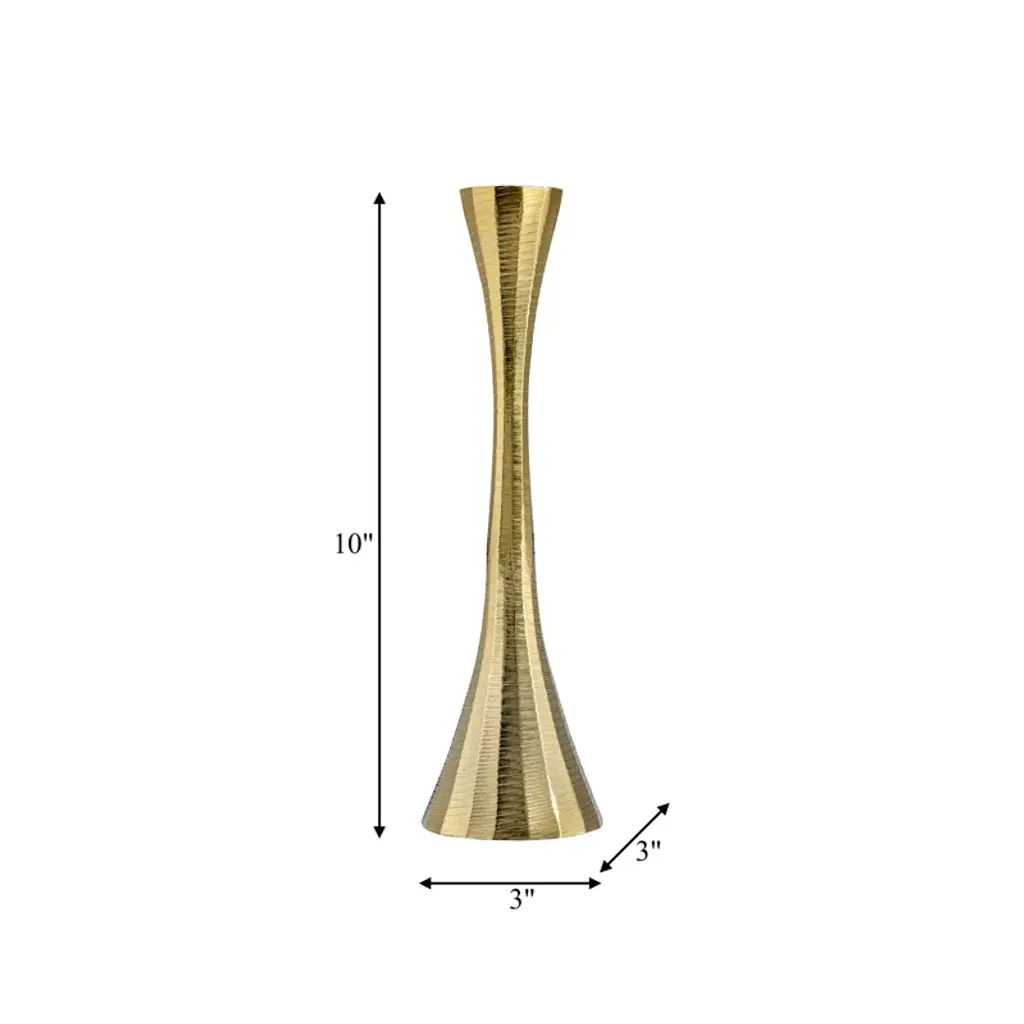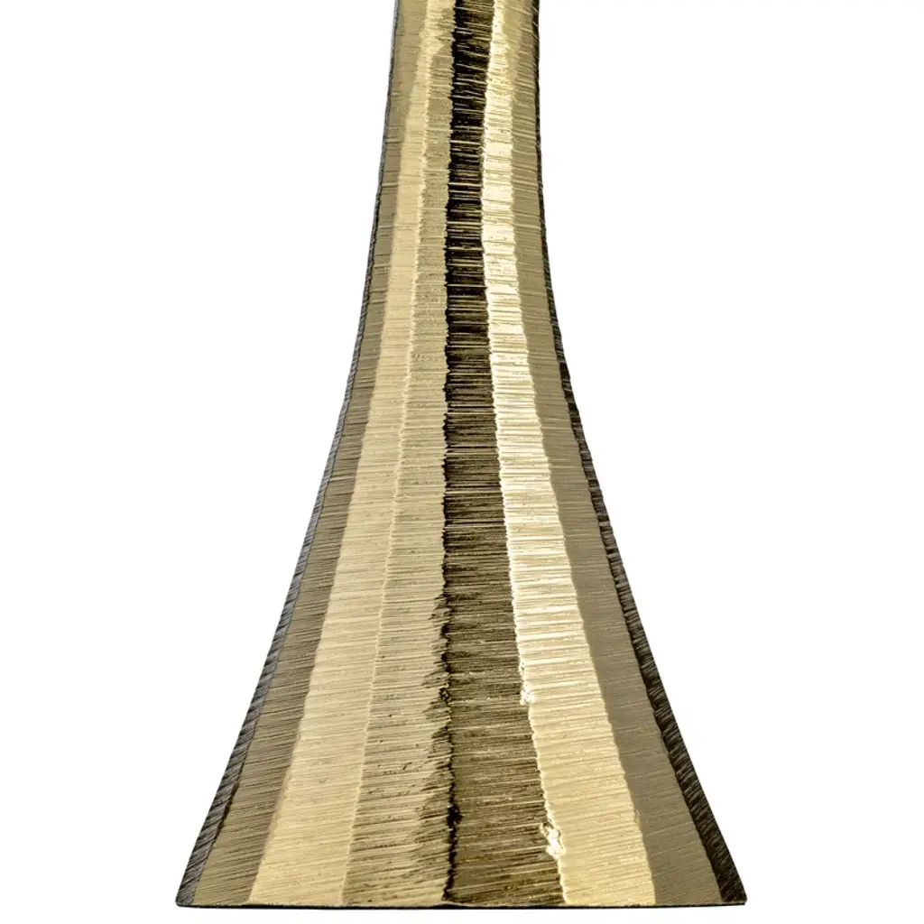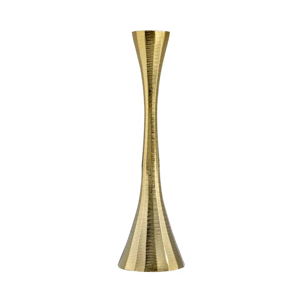 Golden glow. Our candlestick features a streamlined silhouette and textured surface that catches the light, creating a warm ambiance in any room. Handmade from aluminum with a gold finish, it’s designed to hold a single taper candle for a touch of elegance on your tabletop. A conversation starter and a beautiful centerpiece, this candlestick brings a sense of sophistication to your space.
