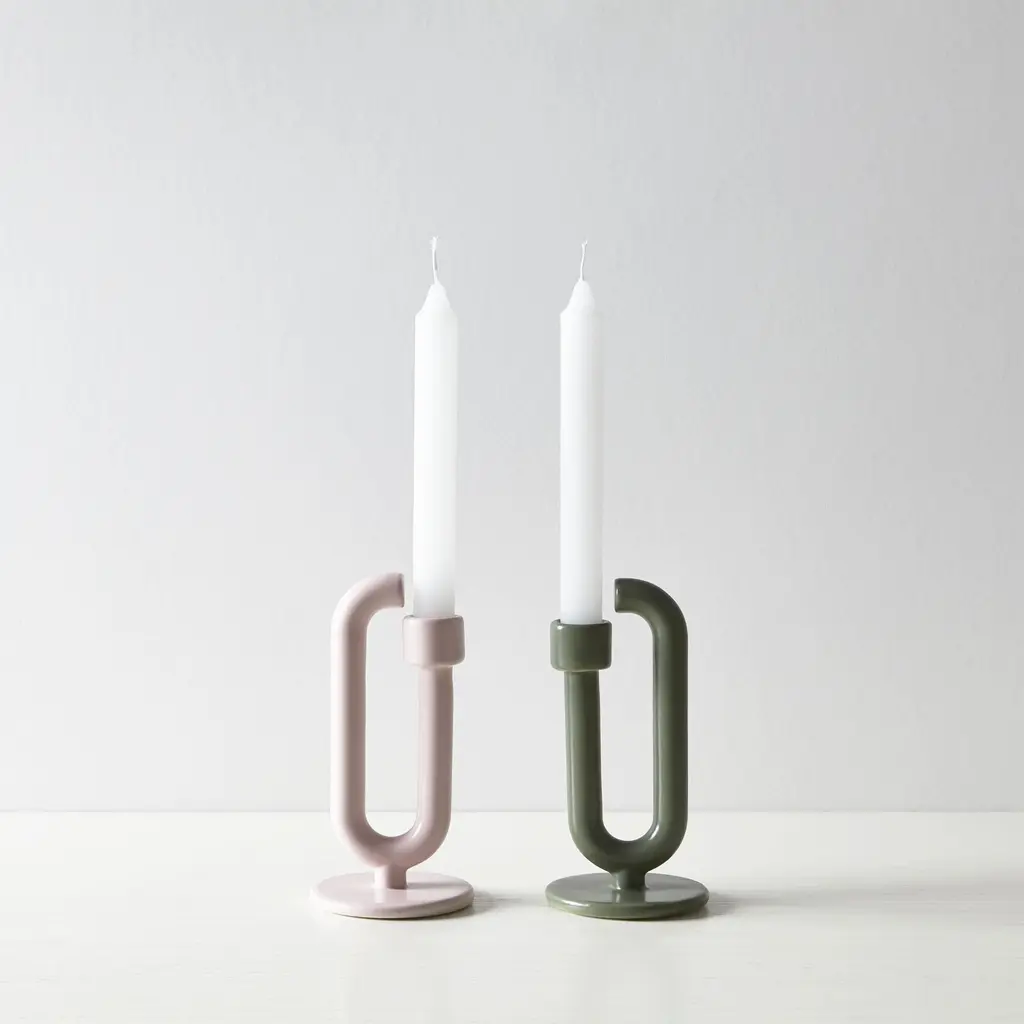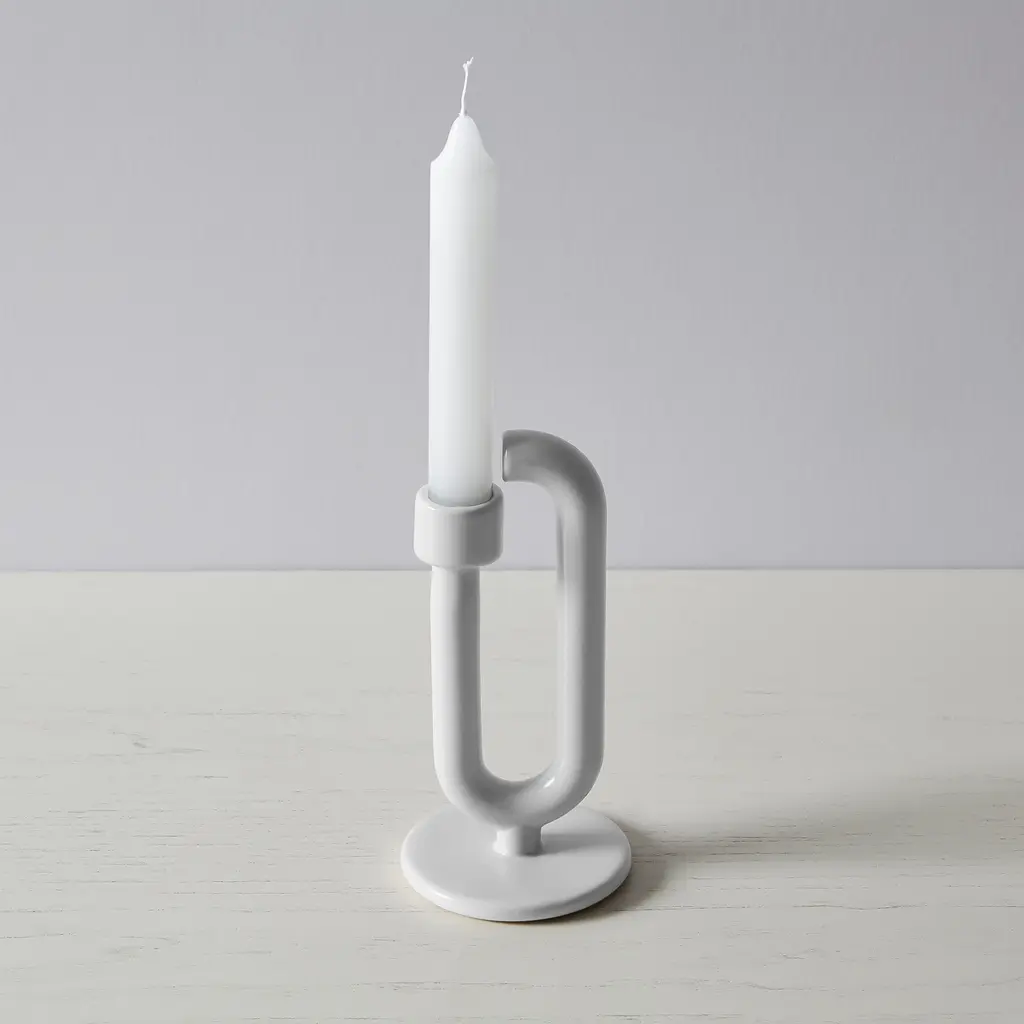Industrial style meets vintage design in the Sandro Candlestick. Created by Sovrappensiero Design Studio for Il Coccio, this candle holder references traditional designs but features a contemporary shape reminiscent of industrial pipes. The large circular base provides support to the curved tubular body that creates the handle as well as the candlestick holder. The design thus invites the user to hold and interact with the object. Made from ceramic, Sandro has a continuous form, a smooth, polished finish, and comes in three colors. Part of a series that include the smaller Ale candlestick.