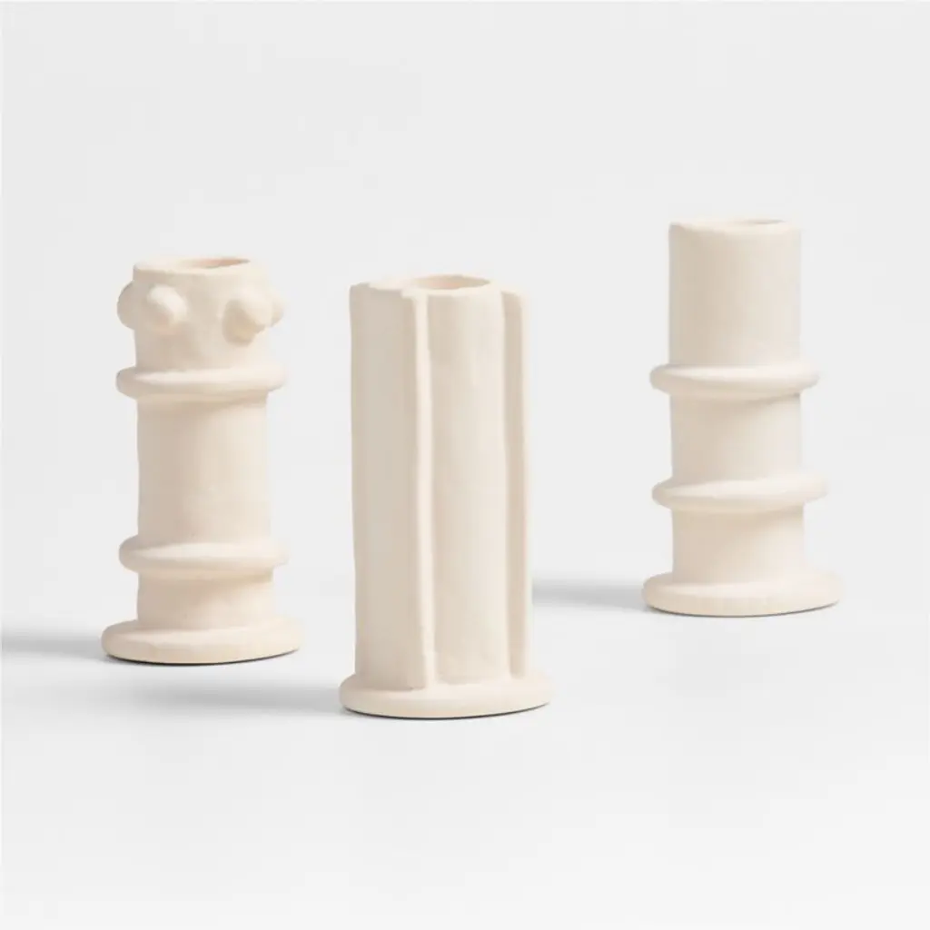 Designed for mixing and matching, our Molly candleholders liven up your mantel, dining table or living room candlelight display with fun, sculptural shapes. The three tall taper holders in the set are made of unglazed stoneware crafted with unique arrangements of raised ridges, dots and flanges.For added impact, combine with coordinating "02" Molly taper holders and "03" Molly tealight candleholders.