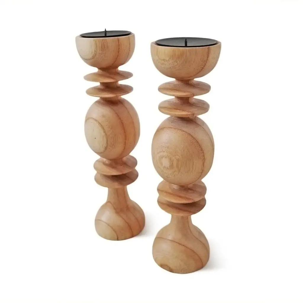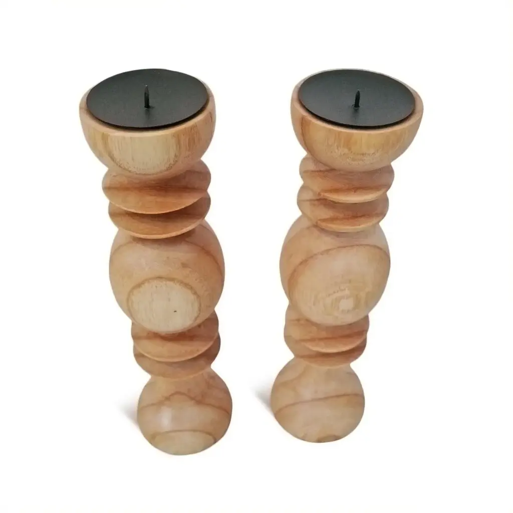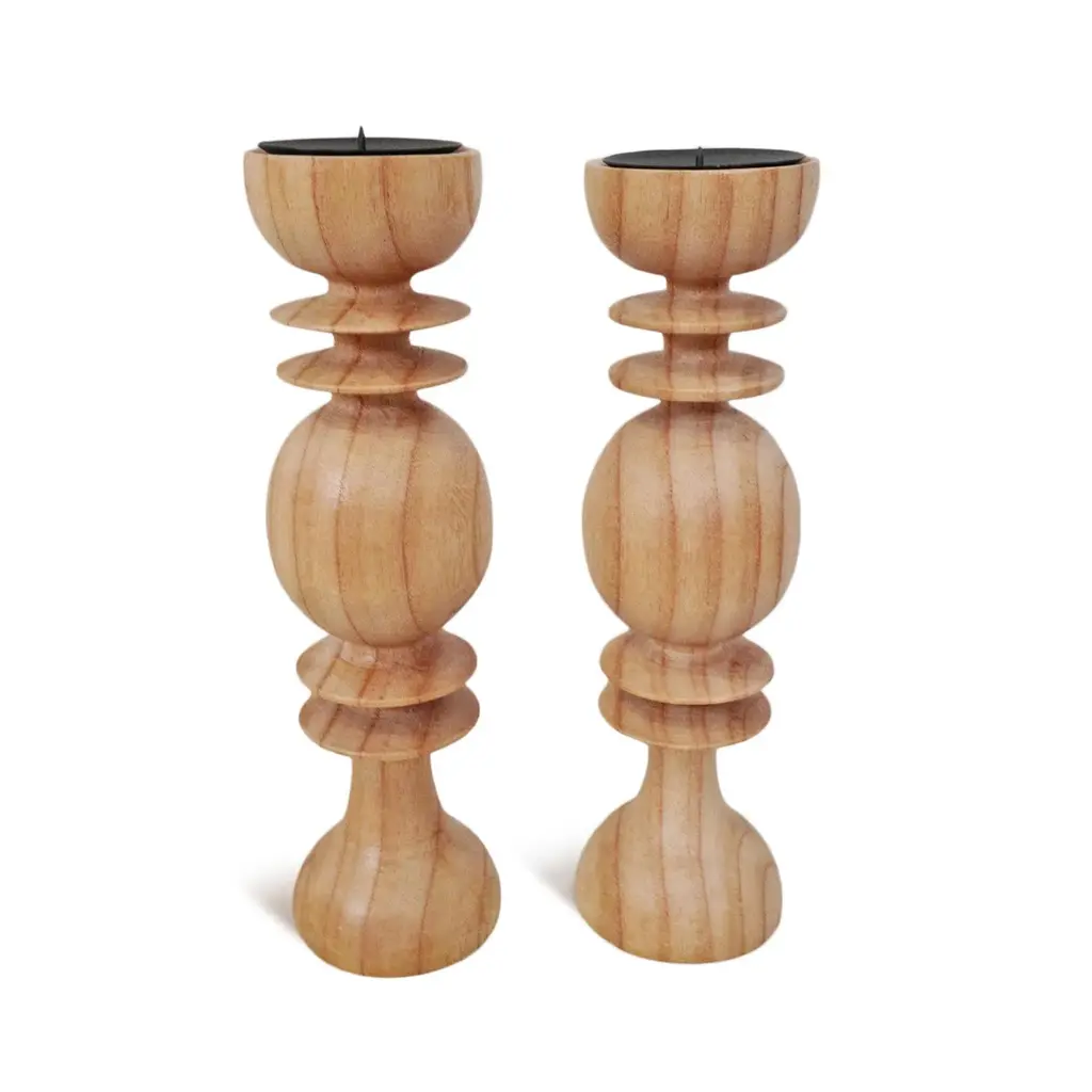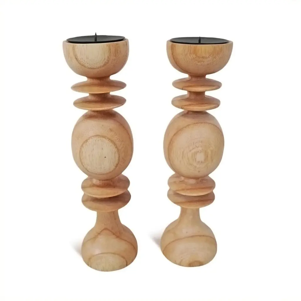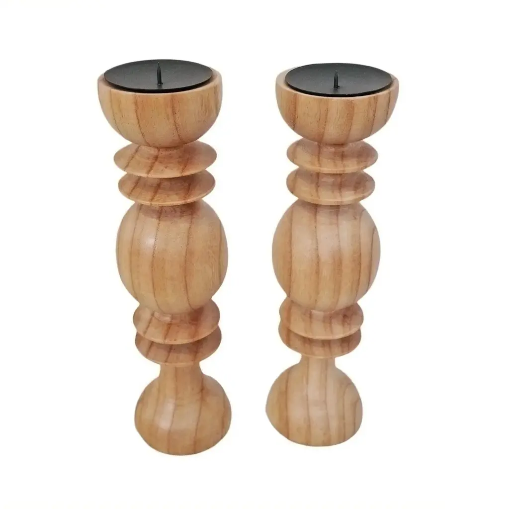 Natural sanded hand carved candle stands with black iron nail dish. Holds 1.5" diameter candle. Each candle stand will have varying natural wood tones and grain. Sold as a set of two.