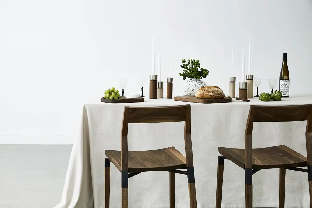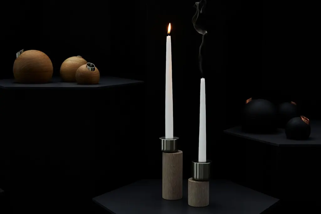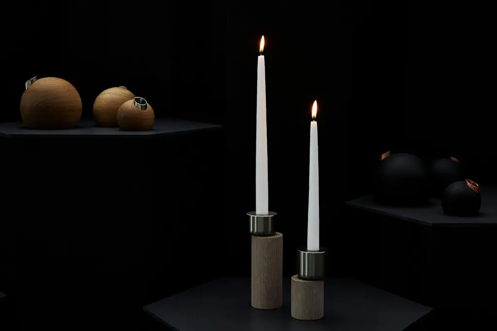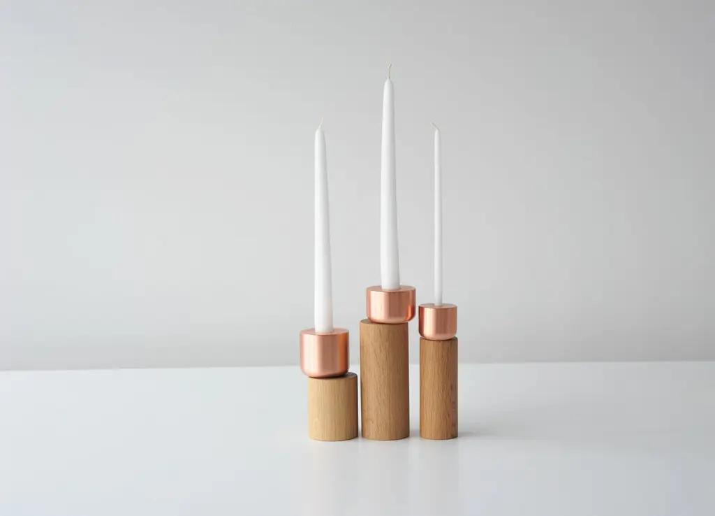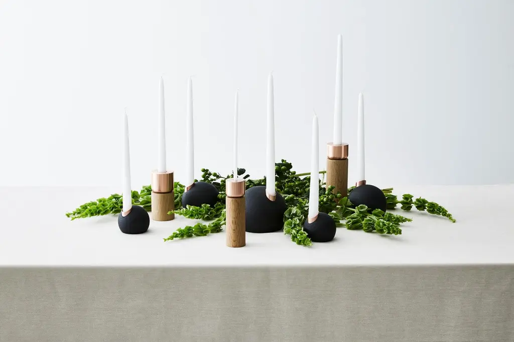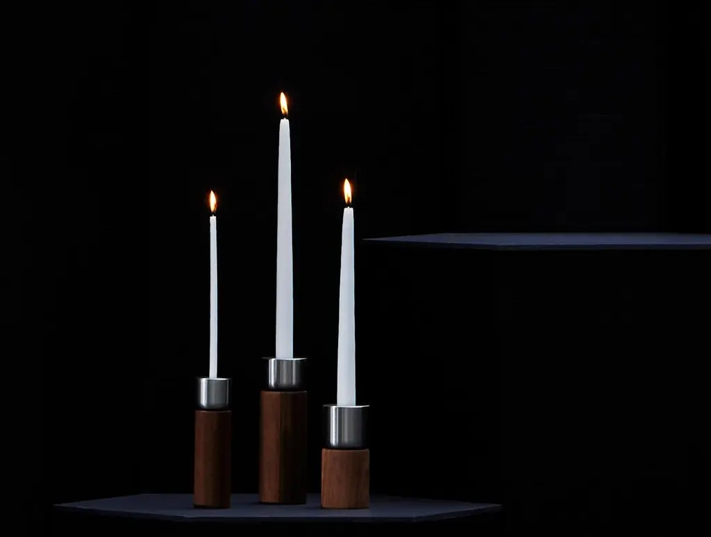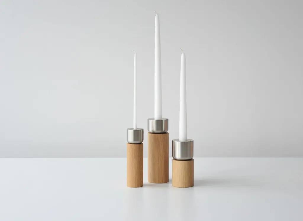 Set of 3 Giant’s causeway candle holder by Hollis & MorrisDimensions:Small diameter 2.5" x height 4.75"Medium diameter 1.75" x height 6"Large diameter 2.25" x height 6.75"Materials: Solid wood, Hardwar oil. Stainless steel, brass, and copper.Also available in natural oak, black oak, white oak, and walnut. And stainless steel, copper or brass finish. Inspired by the basalt columns of the Giant’s Causeway in Northern Ireland, the candle holders showcase hollis+morris’ trademark integrations of solid wood and metal. These stepping stones are formed by the rapid cooling of rock after intense volcanic heat. The candle can be symmetrically centered or slightly off-kilter for a more dynamic formation. A set of three includes a small, medium, and large size. Candles not included, sized for standard 7/8" (M & L) and 3/8" (S) candle widthsBased out of Toronto, Hollis & Morris takes its name from an intersection in Halifax where the company started as a series of garage explorations in design. A steadfast commitment to function with a distinctive approach to design. Hollis & Morris creates handmade furniture and lighting which carefully balances modern and honest designs. Versatile, well crafted, and timeless. Pieces by Hollis & Morris easily complement residential, commercial, and hospitality spaces. Driven by respect towards natural and honest processes, trademark integrations of solid wood and metal celebrate the inherent strengths of each material, resulting in thoughtful, quality pieces made to last with you throughout the years.