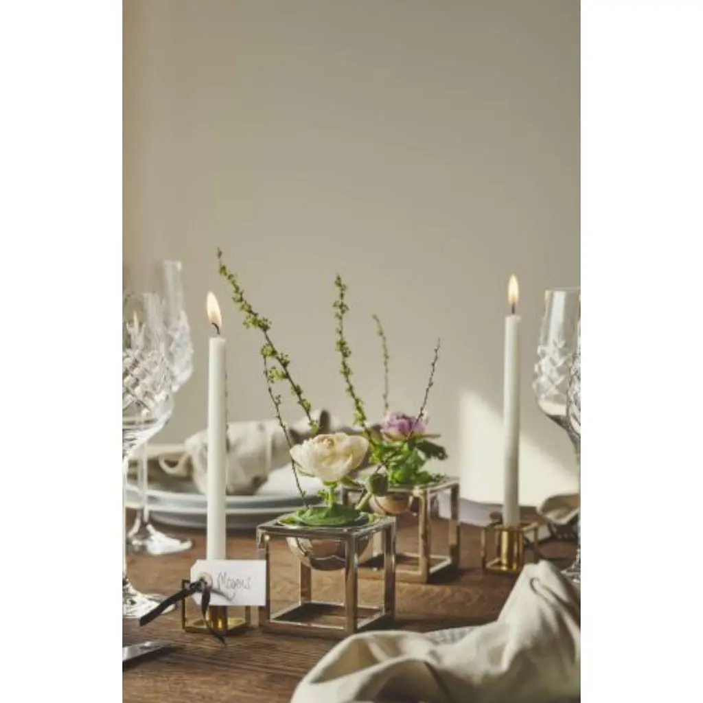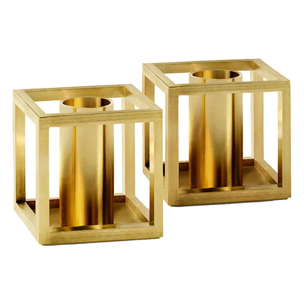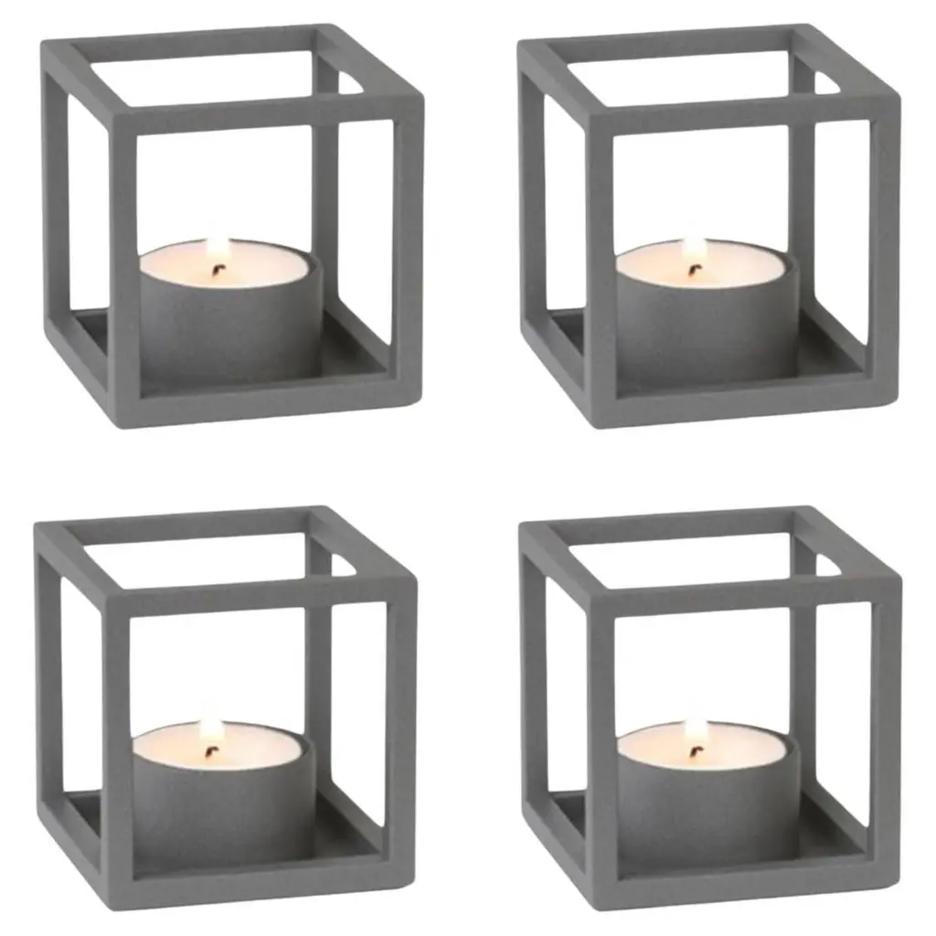 Set of 4 nickel plated Kubus micro candle holders by Lassen.Dimensions: D 3.50 x W 3.50 x H 3.65 cm. Materials: Metal Also available in different dimensions.Weight: 0.15 KgA new small wonder has seen the light of day. Kubus Micro is a stylish, smaller version of the iconic Kubus candleholder and is also designed by Mogens Lassen. It is based on the exact same mathematical geometry as The very first Kubus Candleholder Mogens Lassen designed in 1962. Just very much smaller. Precisely half the size of Kubus 1.The black Kubus-shape frames the light beautifully and adds a mi¬nimalist expression to the table setting. Kubus Micro fits a single candle and is perfect for all kinds of festivities, where the table must be beautifully laid, and you want a very special atmosphere. The candleholder works alone in a beautiful still life or arrange several together for a greater effect.By Lassen is a Danish design brand focused on iconic designs created by Mogens and Flemming Lassen, founded by Lassens’ relatives in 2008. Brothers Mogens (1901-1987) and Flemming (1902-1984) Lassen are known as two of Denmark’s greatest architects and designers. Both were renowned pioneers of Danish functionalism and modernist architecture, honoured with numerous prestigious medals and awards. Headed by Mogens Lassen’s grandson Søren Lassen, By Lassen carries on the brothers’ design philosophy by manufacturing their iconic designs as well as products by other designers that complement the Lassen’s functionalist style. The company’s mission is to continue the tradition of timelessness, functionality and quality, and to introduce the Lassen’s design heritage to new generations.