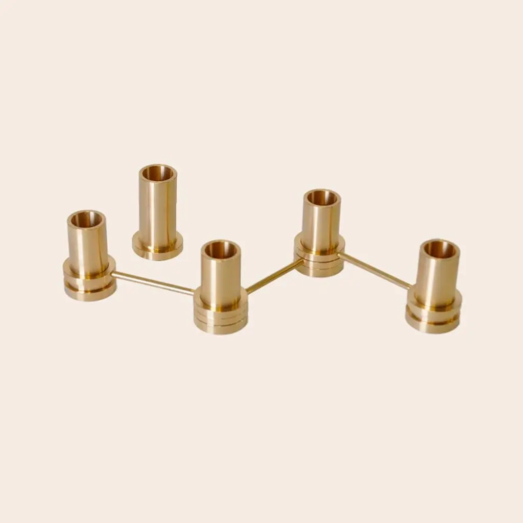 Set of 5 Brass Candle Holder by OxDenmarqDimensions: D 4 x H 6 cmMaterials: Brass5 x candle holder8 x threaded ring4 x combination stickOX DENMARQ is a Danish design brand aspiring to make beautiful handmade furniture, accessories and lighting in natural high-quality materials in fair prices. " When we set out back in 2003, we were primarily working with vegetable-tanned saddle leather thus the name OX was a tribute to our unique leather and the animal providing it.The other half of our name, DENMARQ, is chosen to emphasize that we are a Danish design brand based on the Danish design tradition and that most of our furniture is produced in Denmark. However, DENMARQ not only refers to our home country, but also to the co-founder and designer - DENnis MARQuart.Before finishing his design studies at the Copenhagen Design University, Dennis Marquart did a Blacksmith education. This background is extremely useful when developing and designing products."OX DENMARQ handmade products will only get more beautiful as time passes and natural patina sets in.Many OX products are shaped around marble or vegetable-tanned saddle leather. Stone and leather are materials that will, and should, get marks over time. But they will also age with a very special beauty. When you learn to appreciate the beauty of maturity and of time passing, you have learned to appreciate patina the way it should be appreciated.