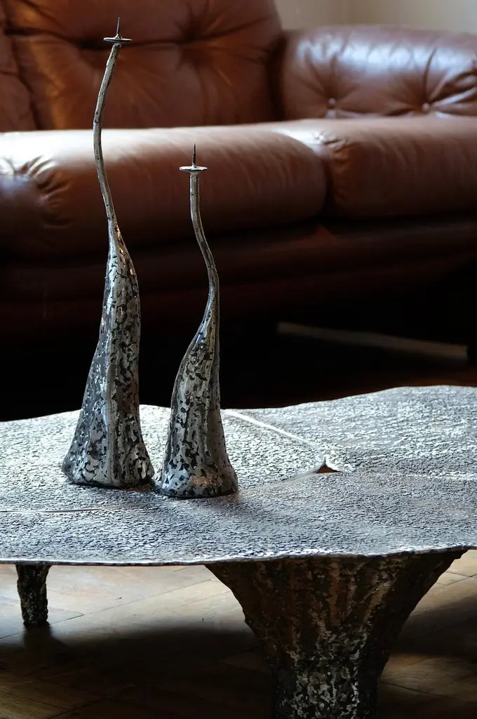 Set of Floral Candle Holder by Chanel KapitanjUnique PieceDimensions: D 90 x W 90 x H 42 cmMaterials: MetalThis collection aims to offer completely unique pieces. Each is different as it is made from scrap metal, steel sheets and other materials left from my metal welding workshop. Assembled and textured in a way that it is impossible to get two identical objects. Yet this technique allows various possibilities in shape and dimension, therefore do not hesitate to ask for a special project (table, chair, lounge, bench, cabinet, etc.) Born in Liège in 1992, Chanel Kapitanj studied Industrial Design in Belgium. Her fascination to metallic materials and manual work, pushed her to learn the profession of welder. Following which, in 2017, she launched her Design and Ironwork studio.Each object is made and assembled by hand in her workshop in Sambreville. Each creation is artisanal, unique and locally sculpted.