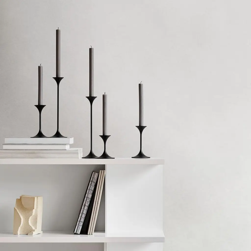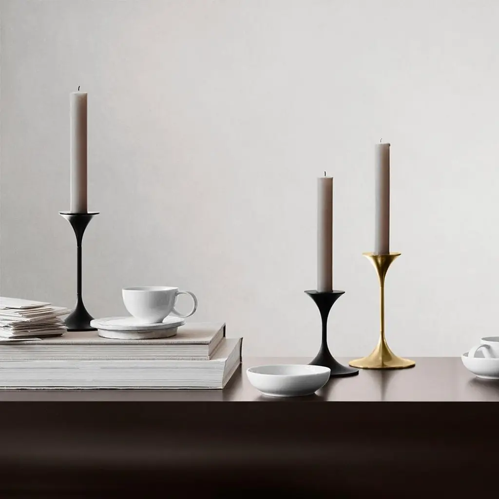Candleholder designed by Max Bru¨el in 1961. Elegant and with a hint of whimsy, the modular candleholder Jazz was conceived in 1961 by Danish architect, ceramist and jazz musician Max Brüel. A slender, graceful silhouette in three heights, Jazz is an elegant addition to the home – by itself or in groups.A Jazz candleholder comes with a top, a base and three interchangeable stems in different heights to fit any occasion.Important information regarding images of products:Please note that some of the images show other colors and variations of the model, these images are only to present interior design proposals. The item that is selling is on the first image. Important information regarding color(s) of products:Actual colors may vary. This is due to the fact that every computer monitor, laptop, tablet and phone screen has a different capability to display colors and that everyone sees these colors differently. We try to edit our photos to show all of our products as life-like as possible, but please understand the actual color may vary slightly from your monitorAbout the designer:Danish architect, ceramicist and jazz musician Max Brüel (1927-1995) was a versatile artistic talent born out of a highly creative family. He won his first architecture competition while still enrolled in the Royal Academy of Art in the 1940s all the while embarking on a career as a jazz musician, which won him international recognition in the 1950s. Alongside his vibrant musical work, Brüel continued his career as an architect and made his mark with the futuristic Herlev Hospital in Copenhagen and the poetic chapel in Glostrup, while also working as a ceramiscist and a designer.About the manufacturer:Karakter is a Danish design company founded on a spirit of exploration, courage and an uncompromising attitude to quality. Rooted in the Scandinavian design tradition with an international outlook, Karakter presents a portfolio of furniture, lighting and objects that is relevant, honest, expressive and sometimes playful. Aspiring to build an enduring legacy, they work with contemporary designers such as Aldo Bakker and PlueerSmitt and present works by the masters Bodil Kjær, Achille and Pier Giacomo Castiglioni, Paul McCobb, Joe Colombo and Angelo Mangiarotti. Each piece has a clear, undeniable expression, ensuring it pride of place in private homes and public spaces worldwide.