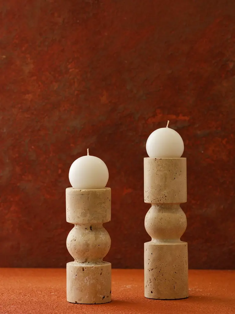 Expertly sculpted from natural beige travertine, this set of handmade candle holders combines architectural balance with organic warmth. Each piece features a bold stacked design with rounded and cylindrical elements that create a visually engaging silhouette. Ideal for tabletop or console styling, their minimalist form complements both modern and rustic interiors. Use them to frame a dining setting, elevate a shelf arrangement, or bring soft candlelit ambiance to your space. As a duo, they offer height variation and sculptural harmony.