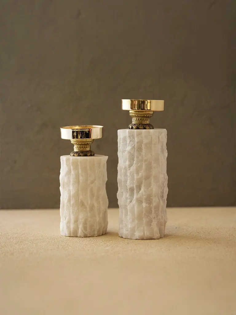 Elevate your ambiance with the timeless elegance of the Set Of 2 Carved Alabaster & Brass Candle Holders. Handcrafted from richly textured alabaster, each holder features a sculptural column base with undulating ridges that catch the light beautifully. The luminous stone is topped with ornately detailed solid brass cups, offering a warm contrast in tone and texture. Sold as a pair, these candle holders are perfect for framing a dining table, mantle, or console—infusing any space with sculptural refinement and atmospheric glow.