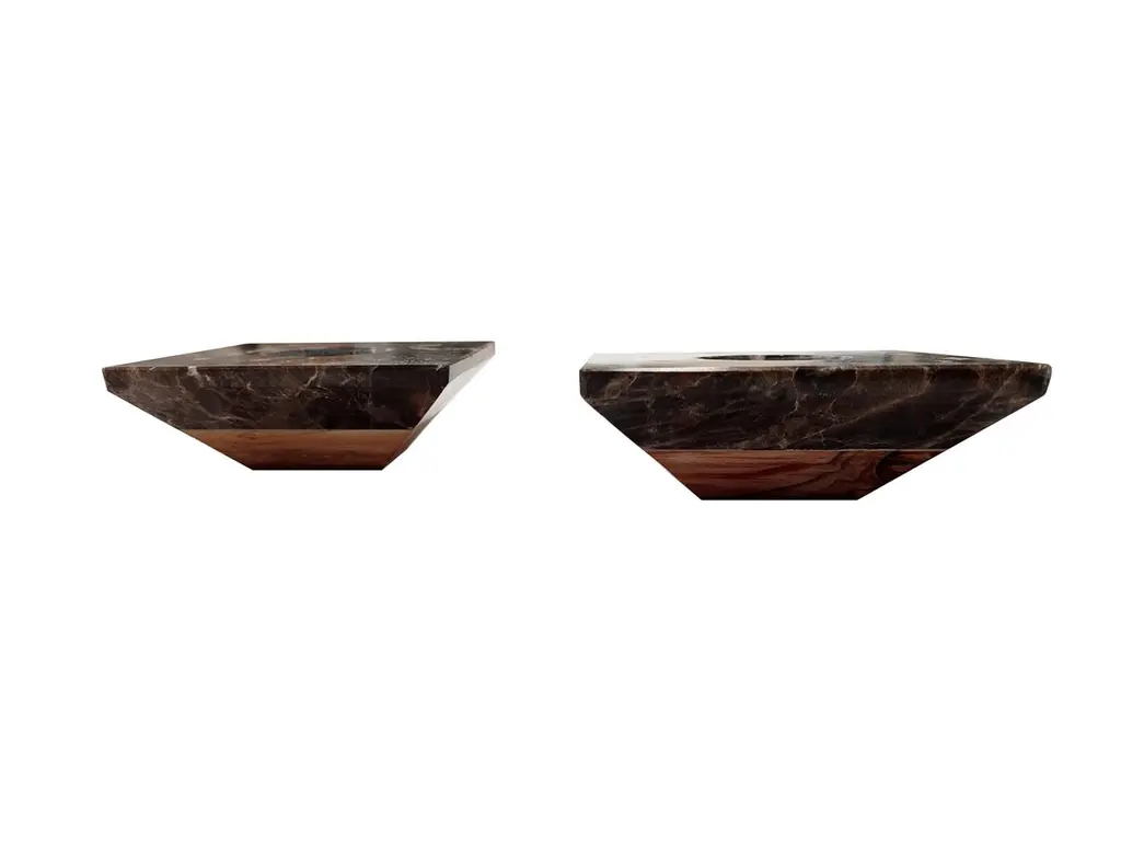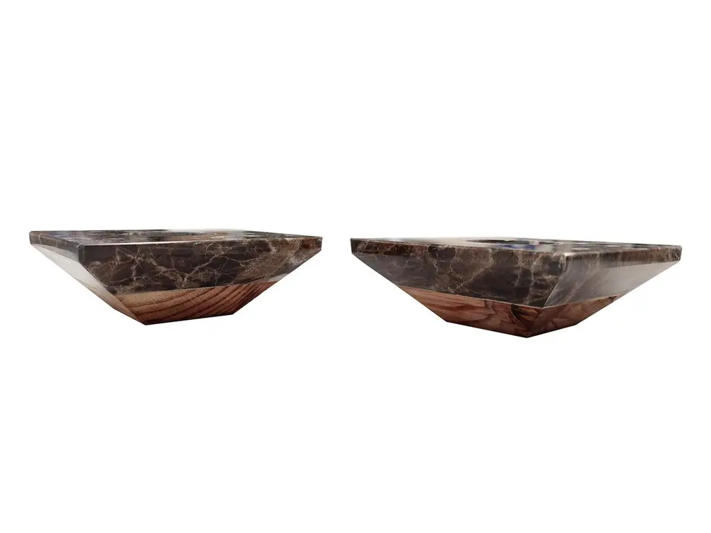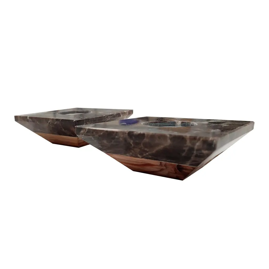 Set of Two Emperor Brown Marble Candle Holders Design Mother’s Day Gift Spain.Set of two candle holders in marble elegant and contemporary design. A pair of candle holders with a modern design made of marble and wood. The structure of the candle holders is square in surface, and inverted pyramidal shape. At the base a wooden block culminates the design piece following the decreasing shape of the marble.This pair of candle holders is a perfect gift for a special occasion. The marble with which they are made is extracted in quarries in Alicante, eastern Spain. Its intense brown color with white inlays brings elegance and brightness to a dark and polished material.A very special decorative item of design, made in Spain and designed by Joaquín Moll for Meddel. The simplicity of its shape is part of its elegance and the exact proportion of the article makes it look light and sober, a perfect gift for a wedding or for parties and special occasions. Marble design to decorate the spaces of the house. Perfect gift for Mother's Day. Also Perfect Gift for Design Lover's Day.