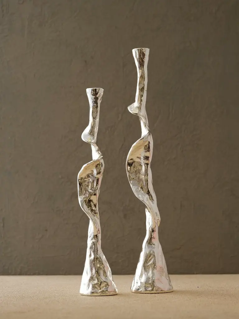 A true fusion of form and flame, the Handmade Brass Spiral Candle Holders embody fluidity with a sculptural twist. Their elongated, helical bodies rise like abstract silhouettes, evoking elegance and artistic motion. Cast in solid brass with a warm gold finish, these candle holders add a touch of timeless luxury to mantels, sideboards, or dinner tables. The irregular hammered texture further enhances their artisanal allure, making each piece a striking standalone or harmonious pair.