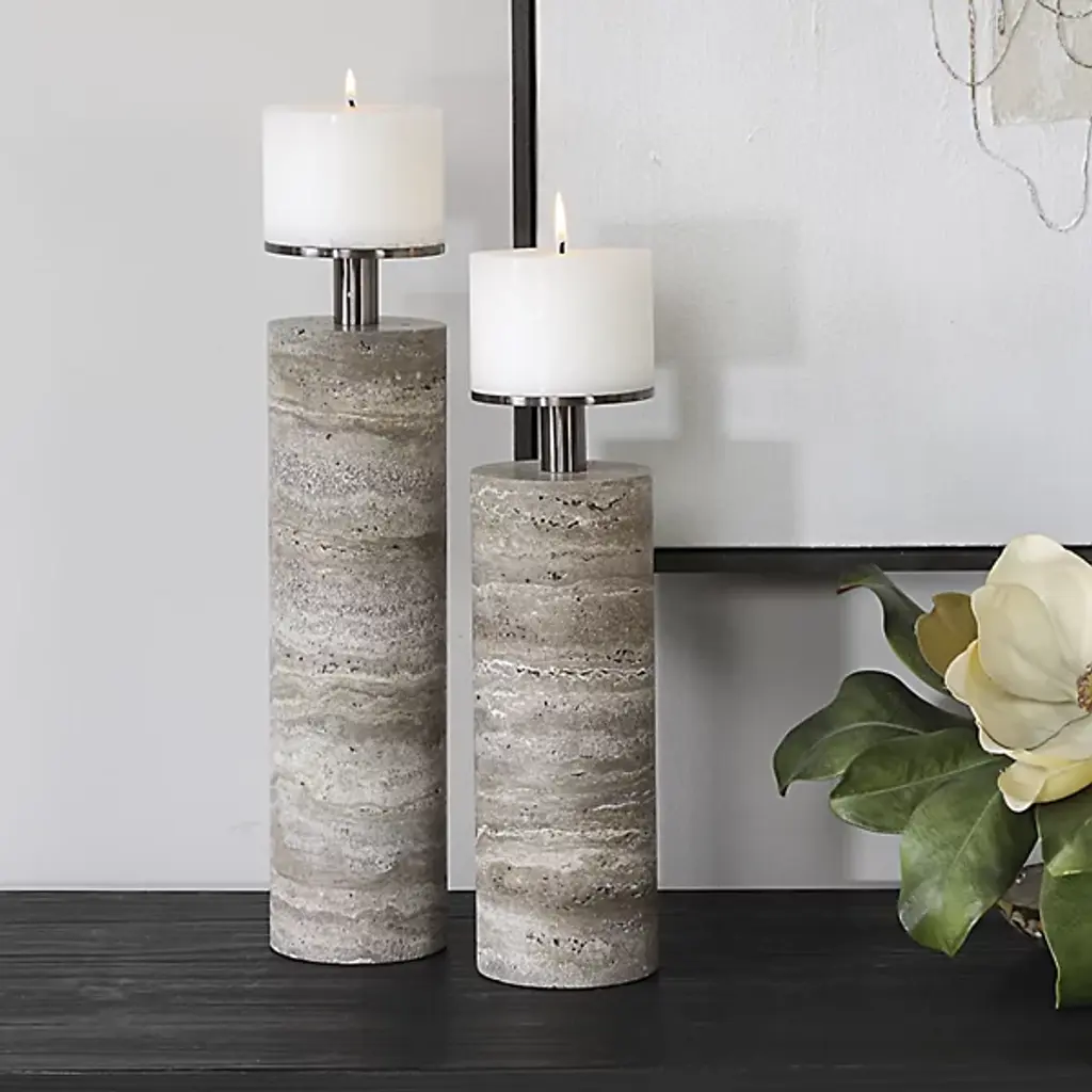 The Shadowstone Candleholders, Set of 2 from Uttermost displays the natural variations of travertine stone, with each cylinder showcasing unique patterns and textures. Metal cups rest atop the stone columns, creating a pleasing material contrast while providing secure placement for the included white candles. The natural stone retains cool temperatures, acting as a heat buffer for burning candles. Their cylindrical form allows for versatile placement against walls or as centerpiece elements. These pieces bridge earthy and refined elements, making them adaptable to various interior approaches. When lit, they produce gentle ambient illumination that enhances evening gatherings.