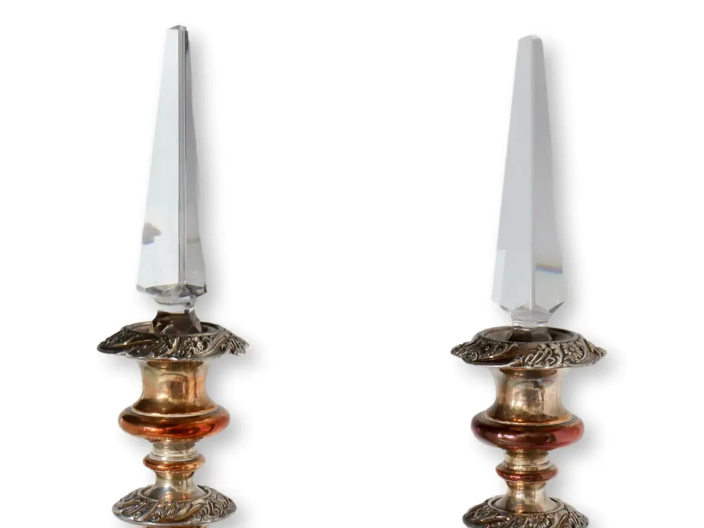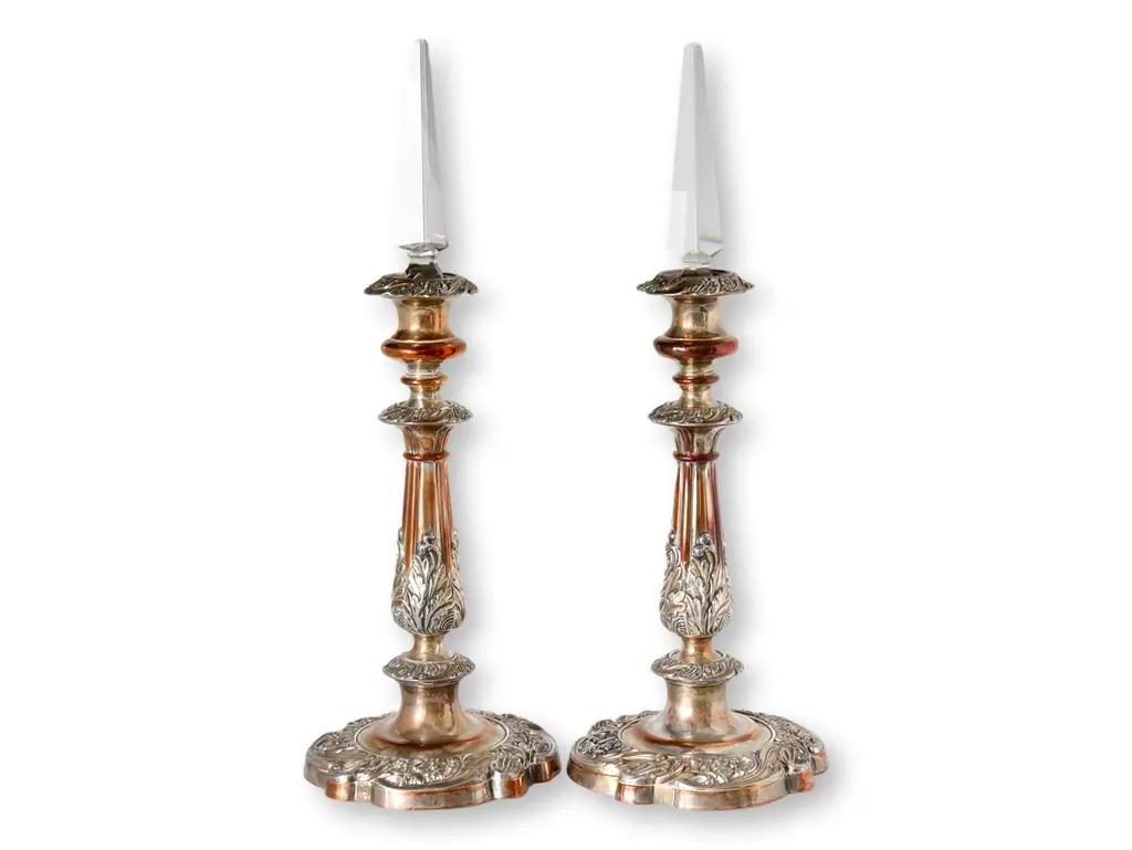 Illuminate your space with these antique Sheffield candlesticks, adorned with crystal lustres (removable, a beautiful way to display when not in use with candles). With every polish over countless years, they have developed a lustrous patina, with certain areas unveiling the underlying copper base. This distinctive wear, emblematic of genuine antique Sheffield plate, remains irreplaceable, ensuring its authenticity and making this piece a timeless testament to artisanship.