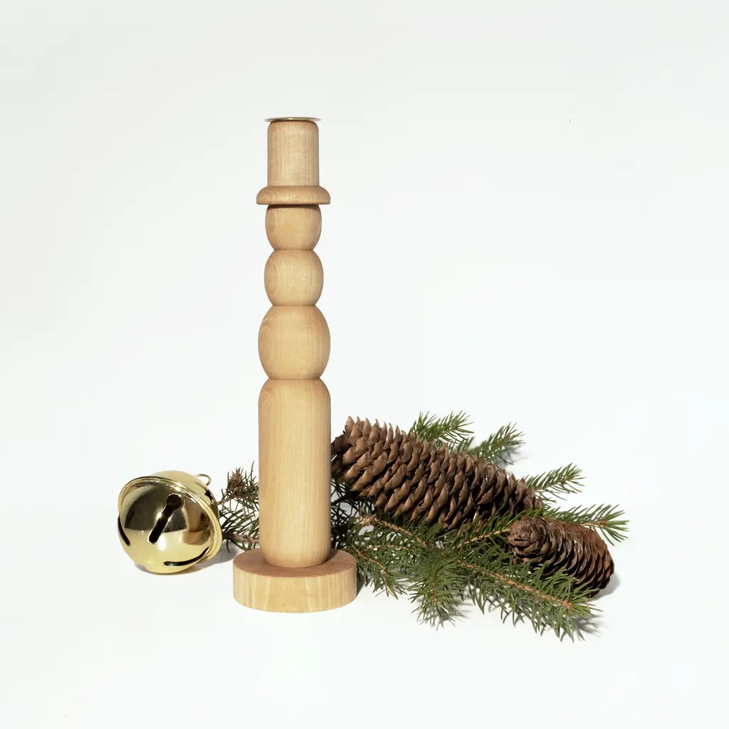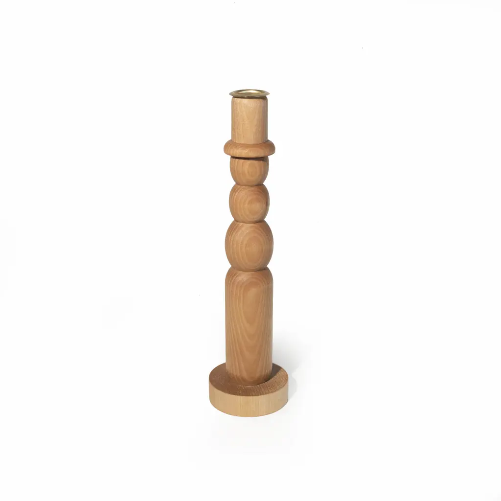 Celebrate the holidays with the perfect home accessories that are both creative and fun. Like this Snowman Candleholder, which recreates the shape of a snowman with a top hat. Crafted from solid wood, this product is both durable and beautifully tactile. The natural finish enhances the textures of timber and preserves the light color of the wood. At the top, a brass insert protects the candleholder from wax drippings and minimizes friction when placing candles. Pair this candleholder with the shorter version to create a more dynamic composition. Proudly made in the USA.