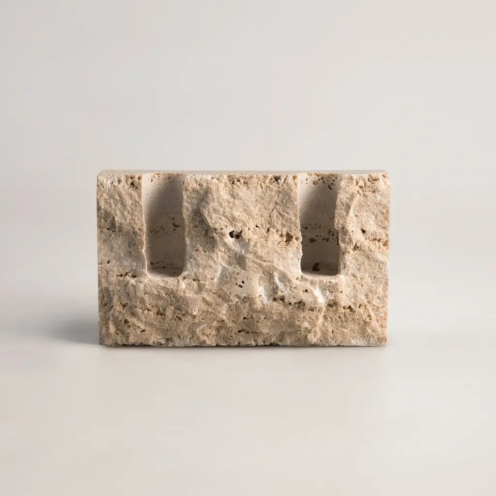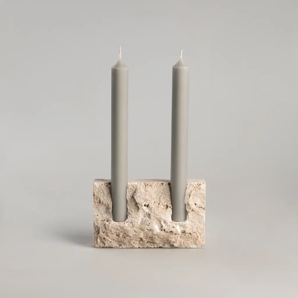 Shine a light on your love of creative design and sustainability with the Snug Candle Holders. Designed by Sanna Völker, these candle holders pair contrasting materials in an imaginative way. Wearing their sculptural beauty with pride, they feature solid rock bases with smooth or hand-chipped surfaces. Two candles “pierce” the stone and create a bold contrast between the soft and solid materials. Every Snug Candle Holder features natural stone sourced from the leftover materials of a local quarry. Crafted by hand, each product is one of a kind and features distinctive variations in both color and texture. The candle holders are natural and have no toxic ingredients or finishes added in the manufacturing process. The untreated surface also highlights the beauty of the natural material. Suitable to use with drip-less candles that measure 22mm in diameter. To avoid staining, please remove candles when they reach the top of the stone base.