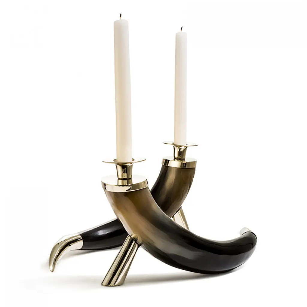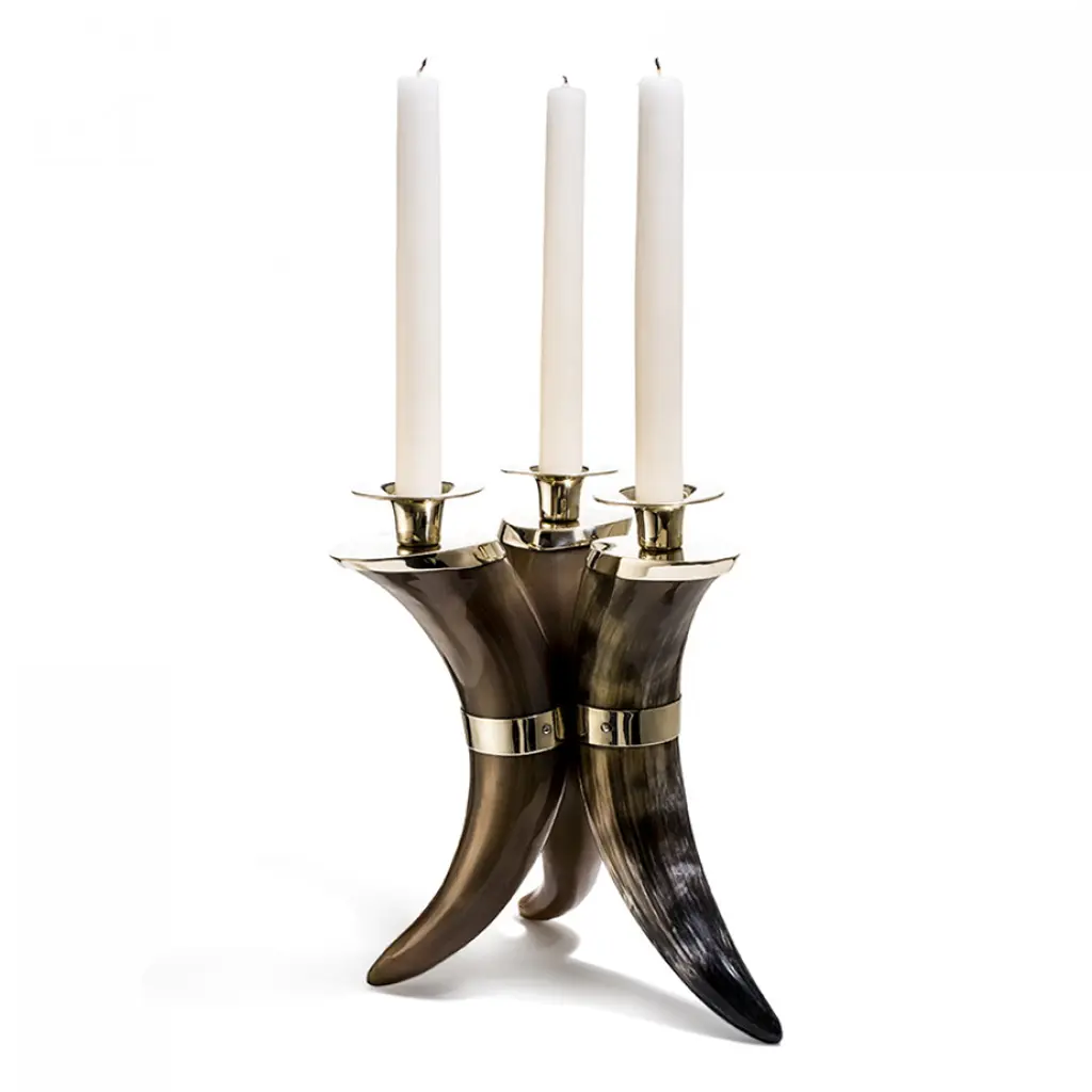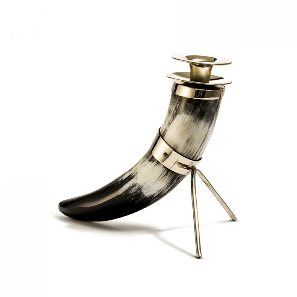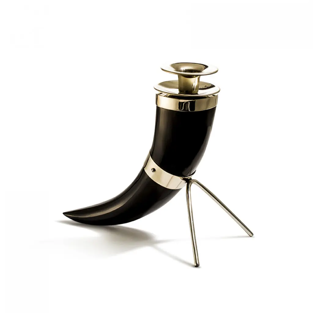 - Handcrafted polished dark bull horn candleholder finished with German Silver accents