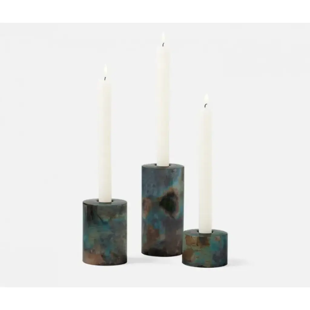Finish: Burnt Silver Material: Stainless Steel Our minimal, cylindrical Spencer candle holders feature burnt metallic finishes with a smoldering, slick shine. Sets of three stainless steel pieces in ascending heights. Blue Pheasant's products are handmade with care by artisans using natural materials. They are not mass produced, so variation between products should be expected, and this is why we love them! It is these irregularities that makes Blue Pheasant what it is—a special brand whose collections are distinctly handmade, full of charm and originality you’ll never find in machine-made products.