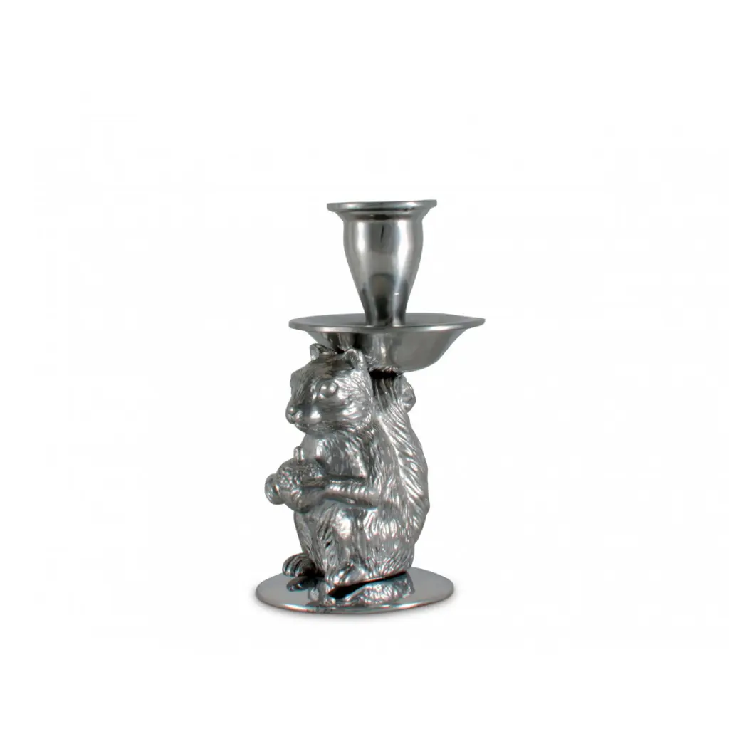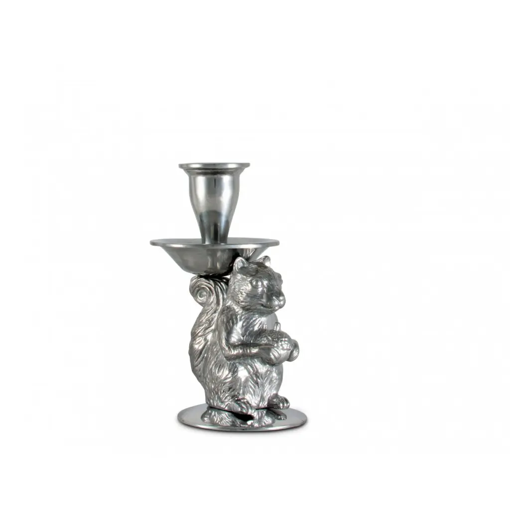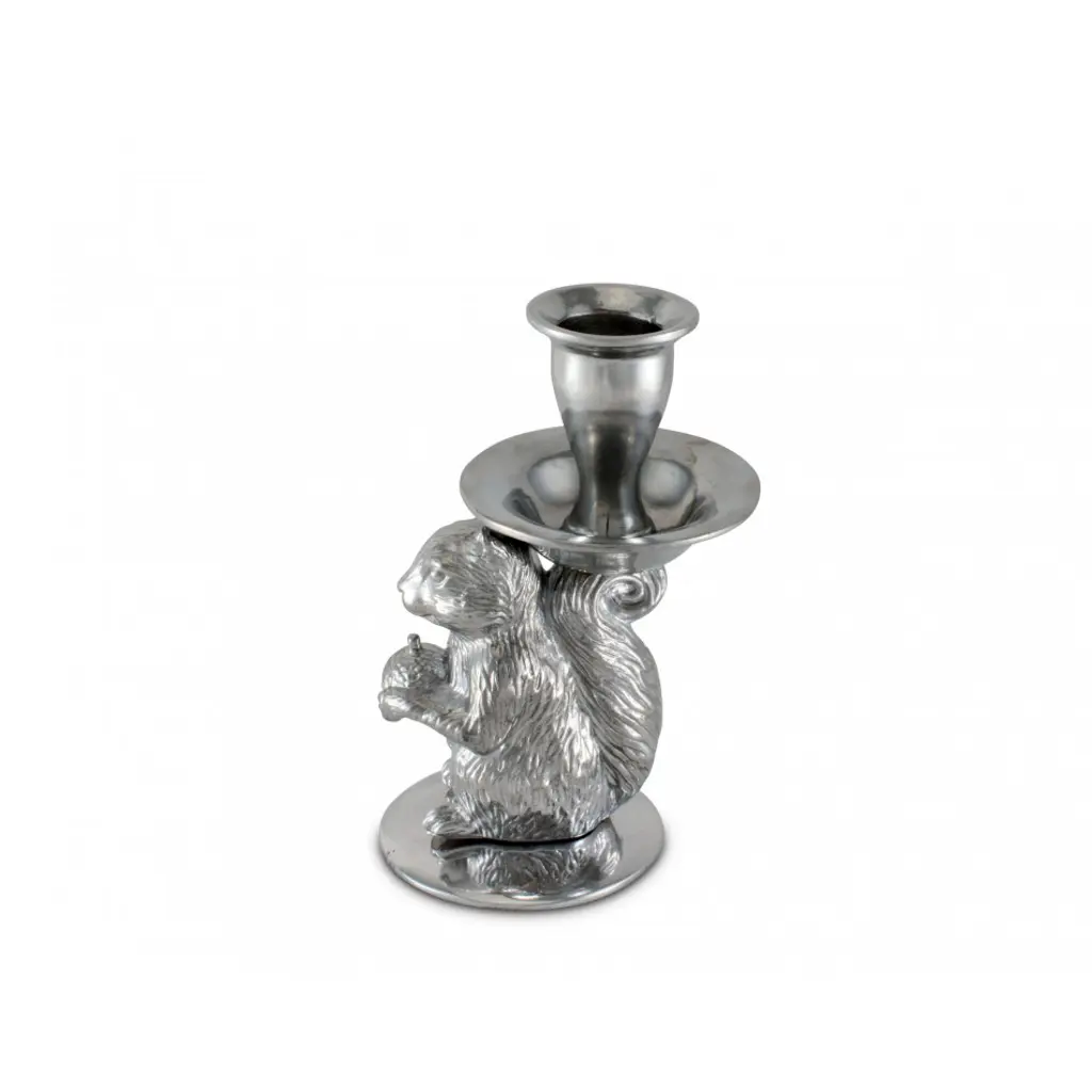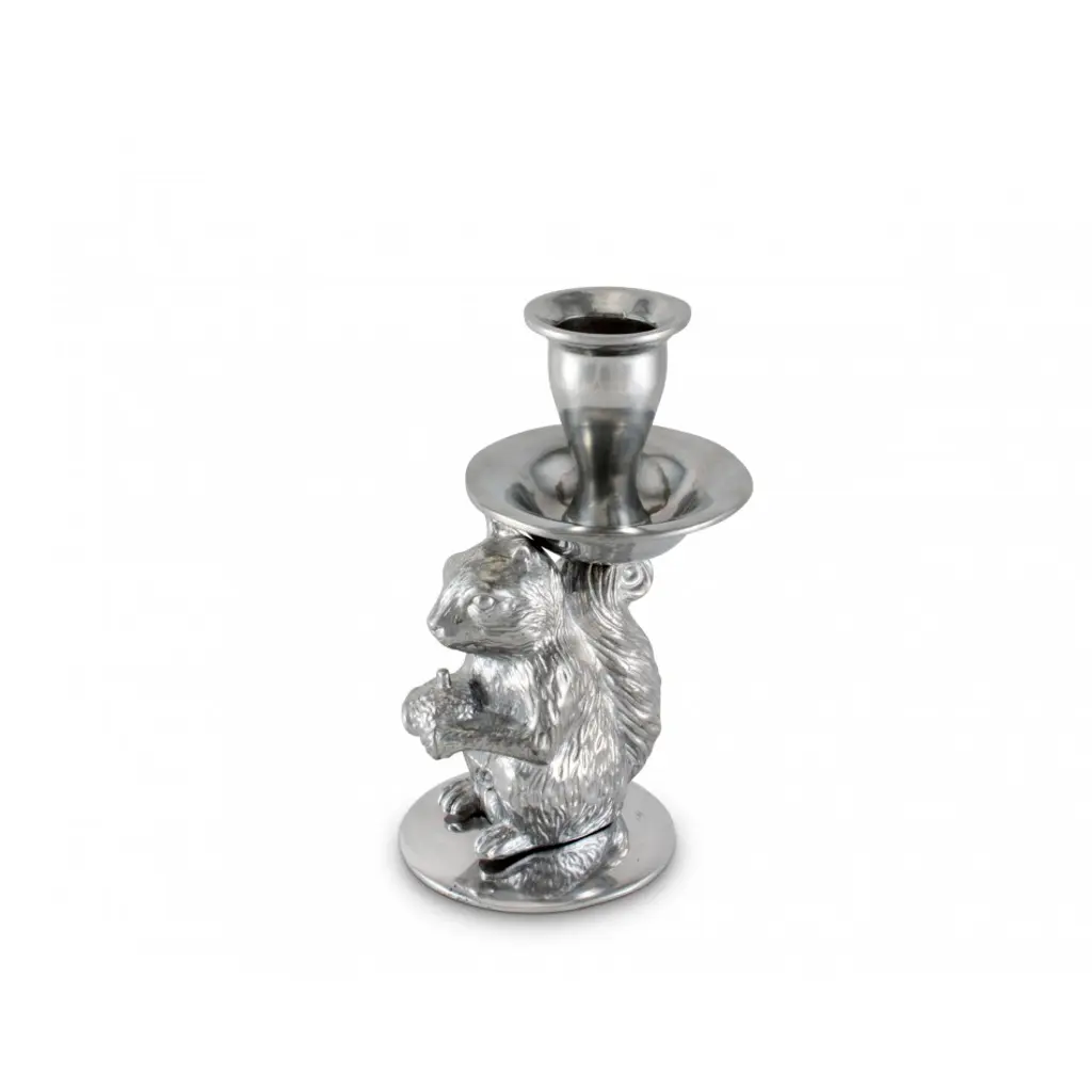Arthur Court’s signature squirrel is ready to light up your home. Our whimsical and deftly detailed squirrel figure holds a precious acorn snack in his paws while balancing the taper candle cup on his head. A full circle drip tray surrounds the candle cup to protect your linens or furnishings from melting wax.
