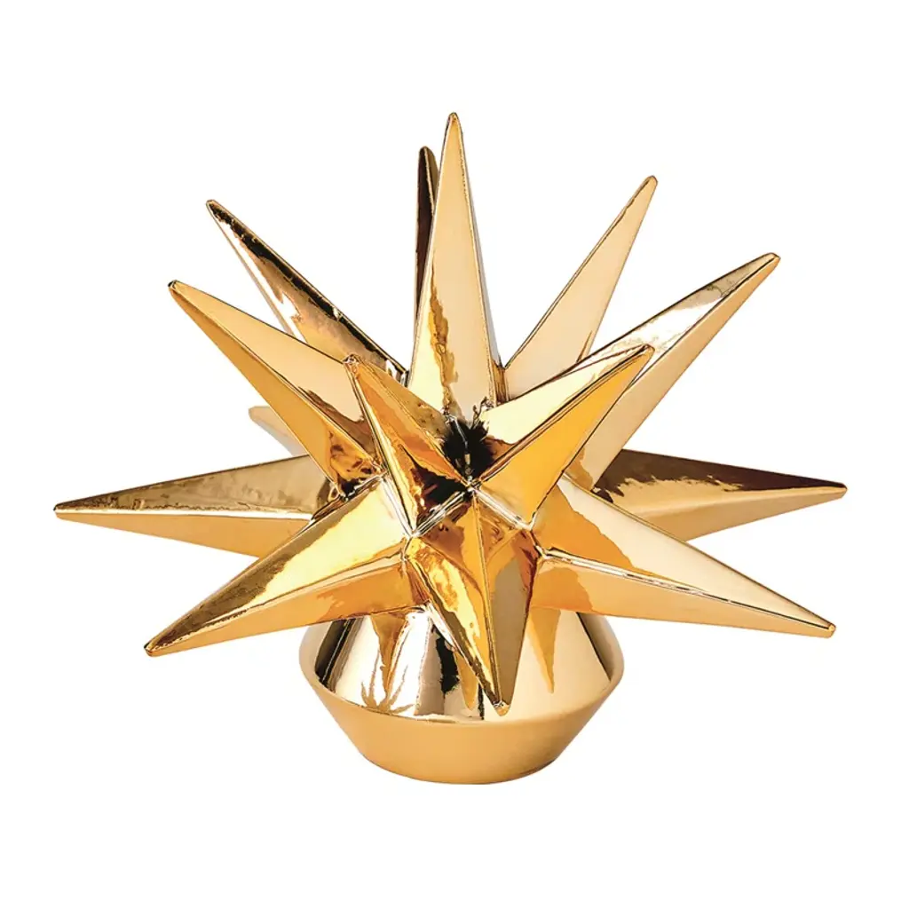 This intriguing candle holder features a starburst shape constructed from a sophisticated brass frame. Filling the interior of the frame, reflective glass triangles capture the light for a dynamic display when the candle is lit. Without a candle, this piece easily stands alone as a handsome decorative accent.