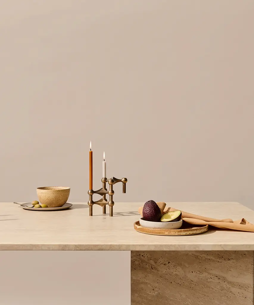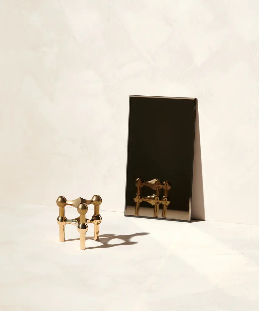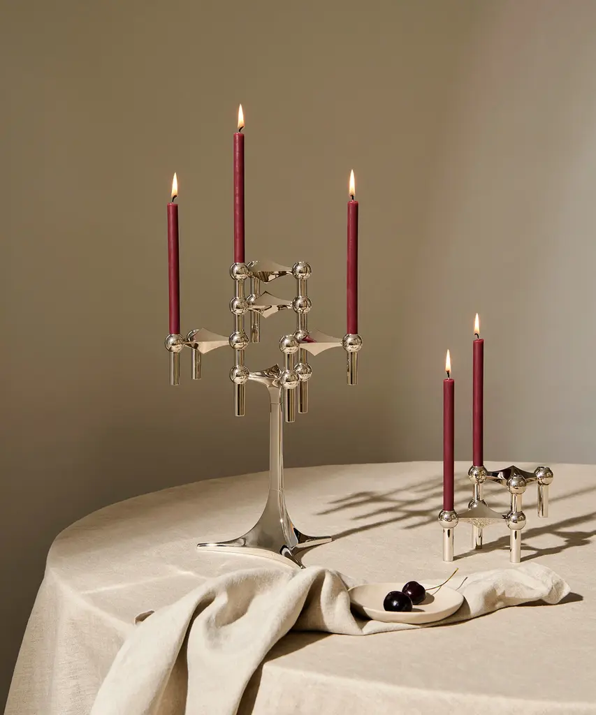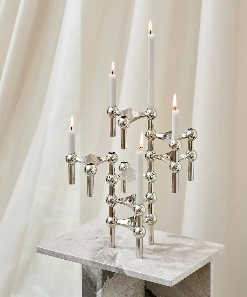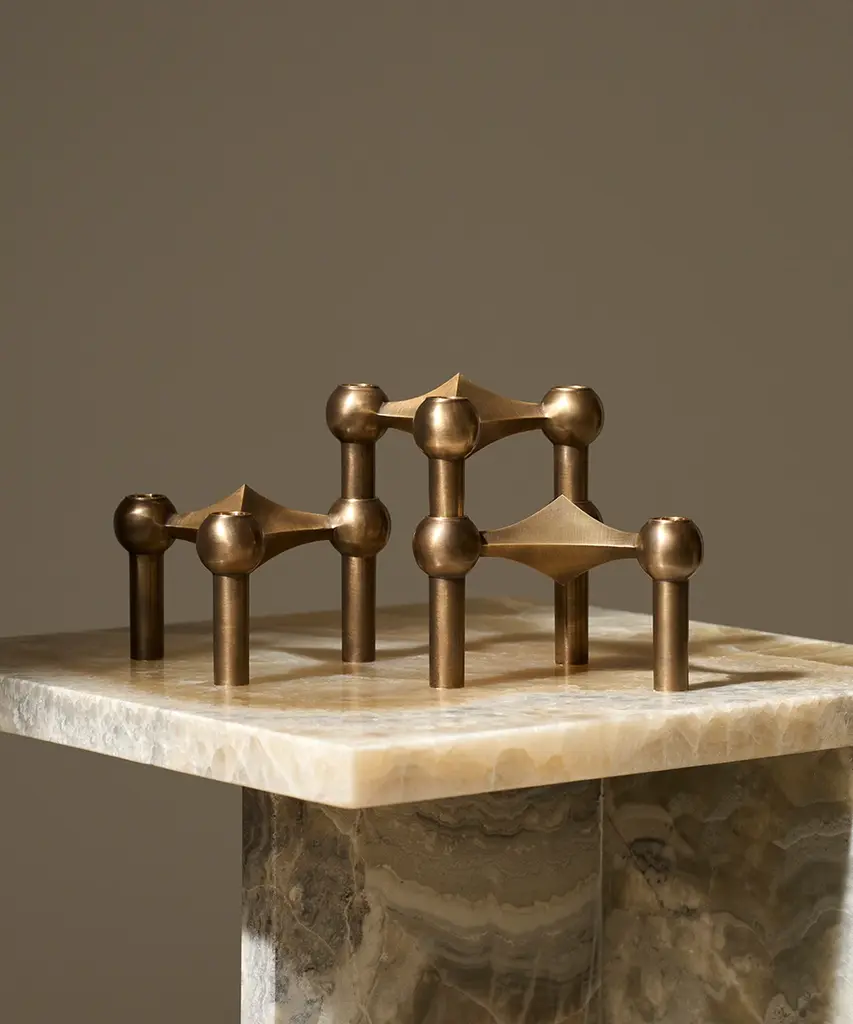 The STOFF Nagel candle holder collection offers a diverse range of exquisite editions, each with its unique appeal. The Rose Gold edition exudes elegance with its soft, golden-tinged shade of pink, which adapts discreetly to its surroundings. The Black Chrome edition, rooted in classic chrome, brings a futuristic, masculine elegance to interior decor. The Bronzed Brass edition is an exclusive piece, made from solid brass with a bronzed finish achieved through oxidation. Three holes are polished to create a clean brass surface. The Matte Black edition offers a modern, raw twist to the classic design. The solid brass candle holder is the most exclusive member of the STOFF Nagel candle holder family. Lastly, the Chrome edition, the very first and original, remains a collector's item in homes around the world. The iconic STOFF Nagel candle holders today are considered a collector's item in homes around the world - a personal statement and a malleable sculpture ready to assume the shape of its owner's unique creativity. Create and combine it with other Stoff Nagel designs and use it with taper candles, or leave it merely as a decorative sculpture. STOFF Nagel is a Danish design brand founded in 2015 and known for the relaunch of the iconic STOFF Nagel candle holder.