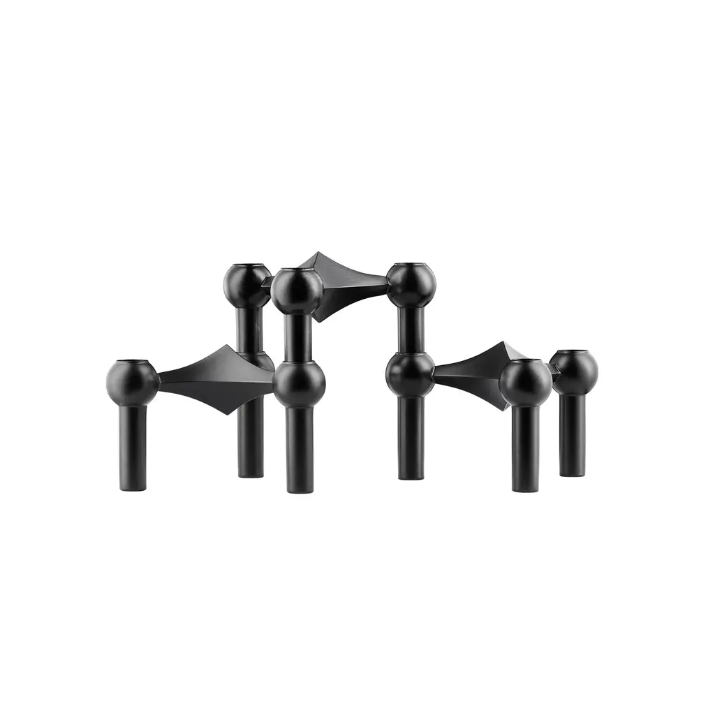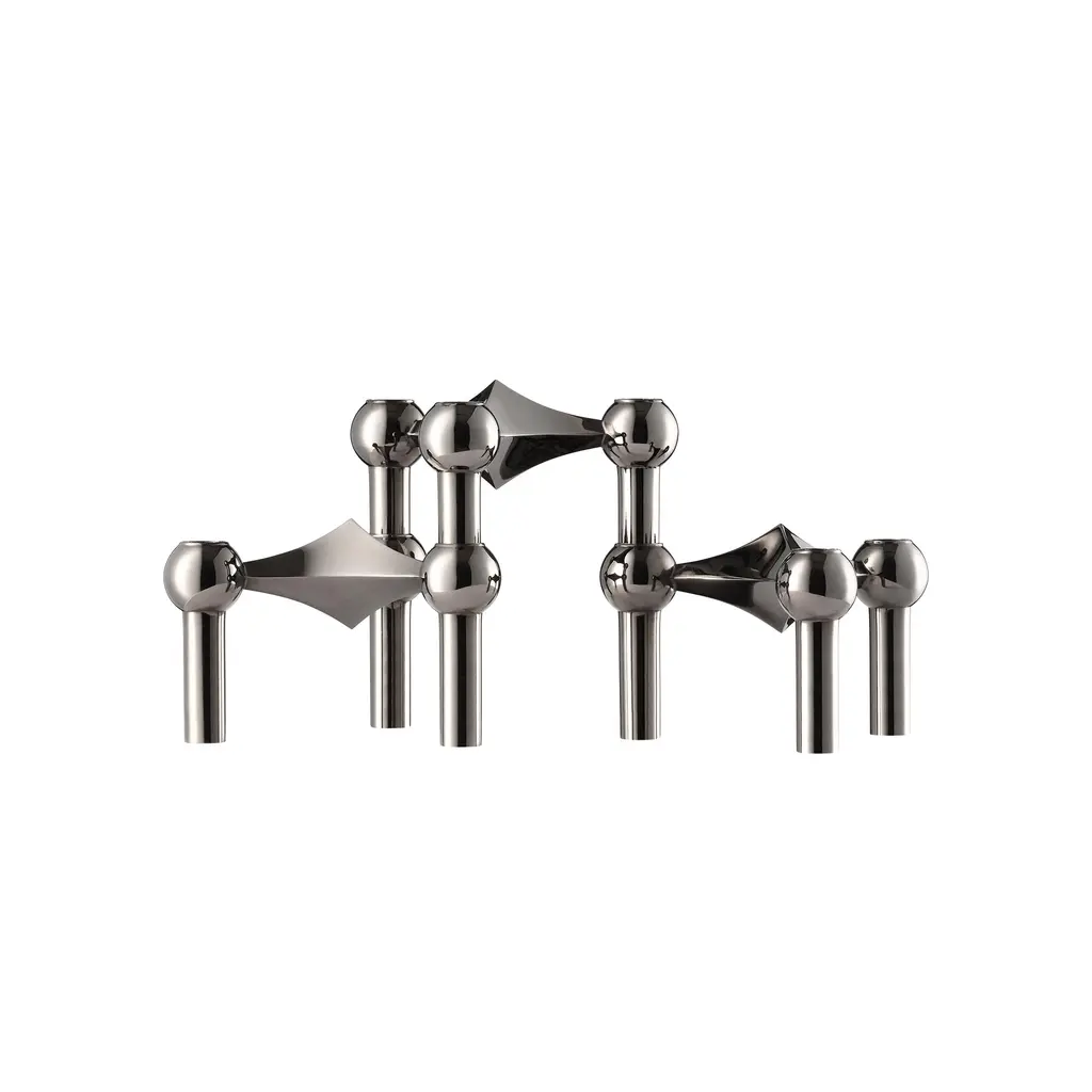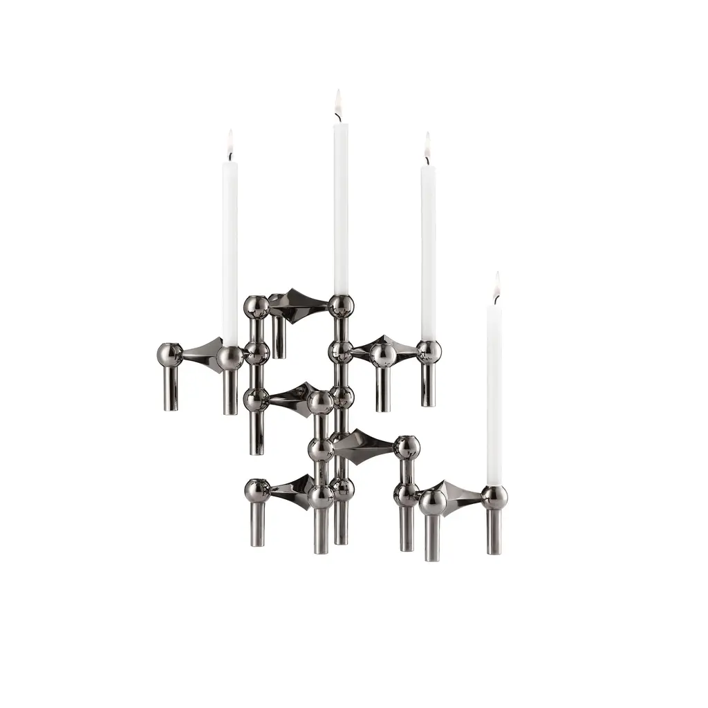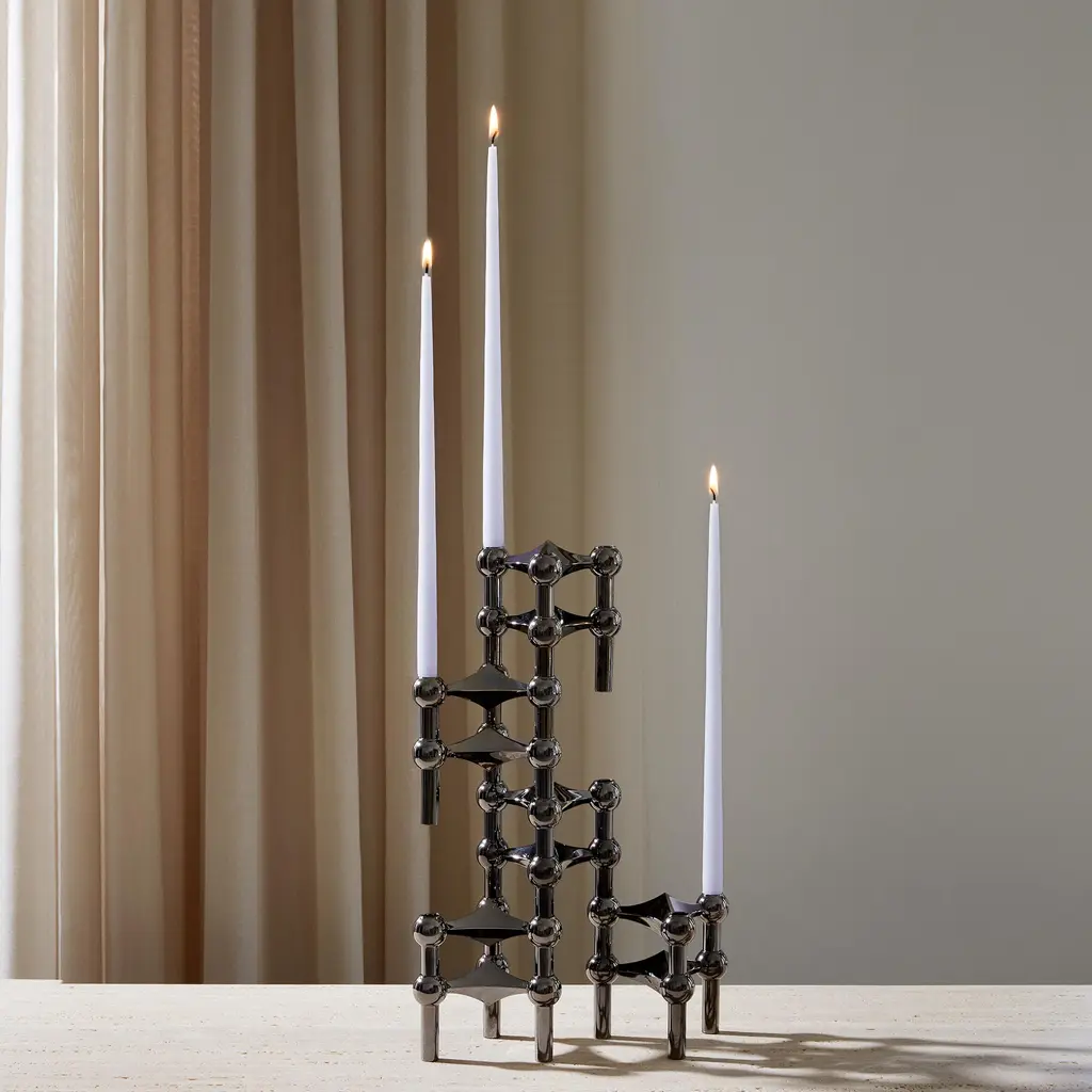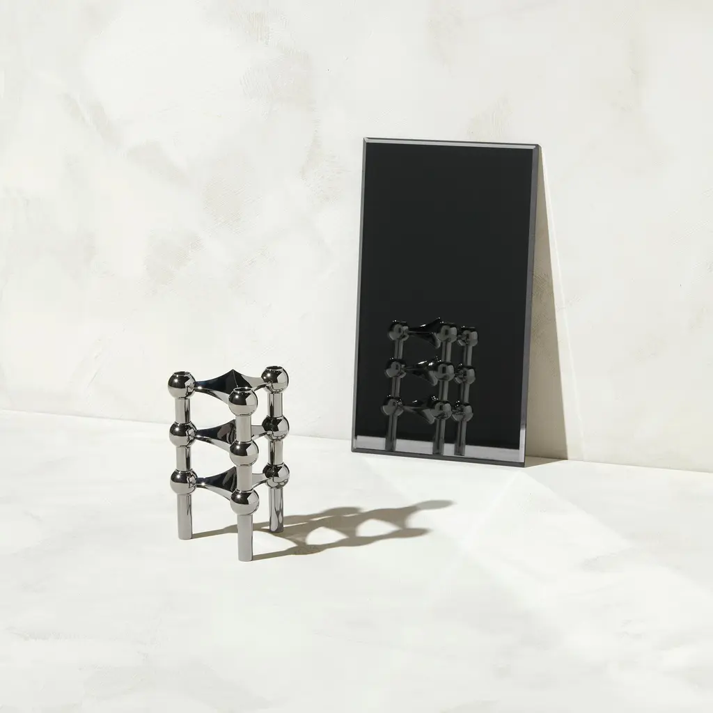 The STOFF Nagel candle holder was born in late-1960s Cologne, from the collaboration between Hans Nagel and architect Werner Stoff. Each module stands on three legs and offers three sockets. Link one to another and the form begins to shift—sometimes a single accent on a shelf, other times a sprawling constellation across a dining table. This boxed set of three gives you a foundation to play with. Use them as separate candle stands, or build them into something taller, wider, and more sculptural. The beauty is in the change: they can be re-arranged endlessly. Available in several finishes—polished chrome with a mirror shine, brushed metals with a softer glow, or brass that darkens as it ages—each option brings a different mood while keeping the same unmistakable silhouette. At just under 3″ tall (6.9 cm), they’re compact enough to handle easily yet dramatic when combined.