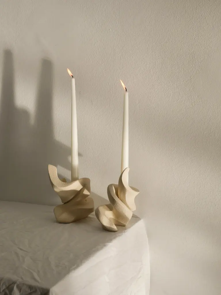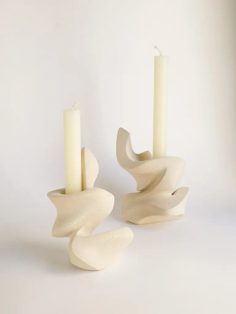 Stoneware Clay Set Dance of Light Candleholder by Aleksandra KrasnopolskaDimensions: W 12 x D 10 x H 15.5 cm, W 12 x D 12 x H 15 cmMaterials: Stoneware clay. Light glazewash appliedwith an airbrush.Weight: 0,8 kg and 1 kg.Collection: “Ocean”Aleksandra Krasnopolska is a contemporary artist from Odessa, Ukraine. Aleksandra worked as an architect and interior designer before turning to sculpture. When she picked up clay for the first time, she fell in love with the material. "The most amazing thing is how easy and beautiful I did it the first time, how pleasant and facile the clay was," she says. "It was love at first touch!" Krasnopolska's sculptures are biomorphic, seeming to slide and shift as you walk around them. Krasnopolska's work evokes the beautiful female form, as well as the waves of the Black Seas, where Aleksandra draws so much of her inspiration. The sculptures are made using a process that the artist refers to as "flow art." Every piece is a form of meditation.