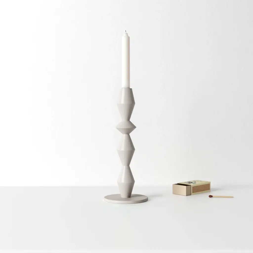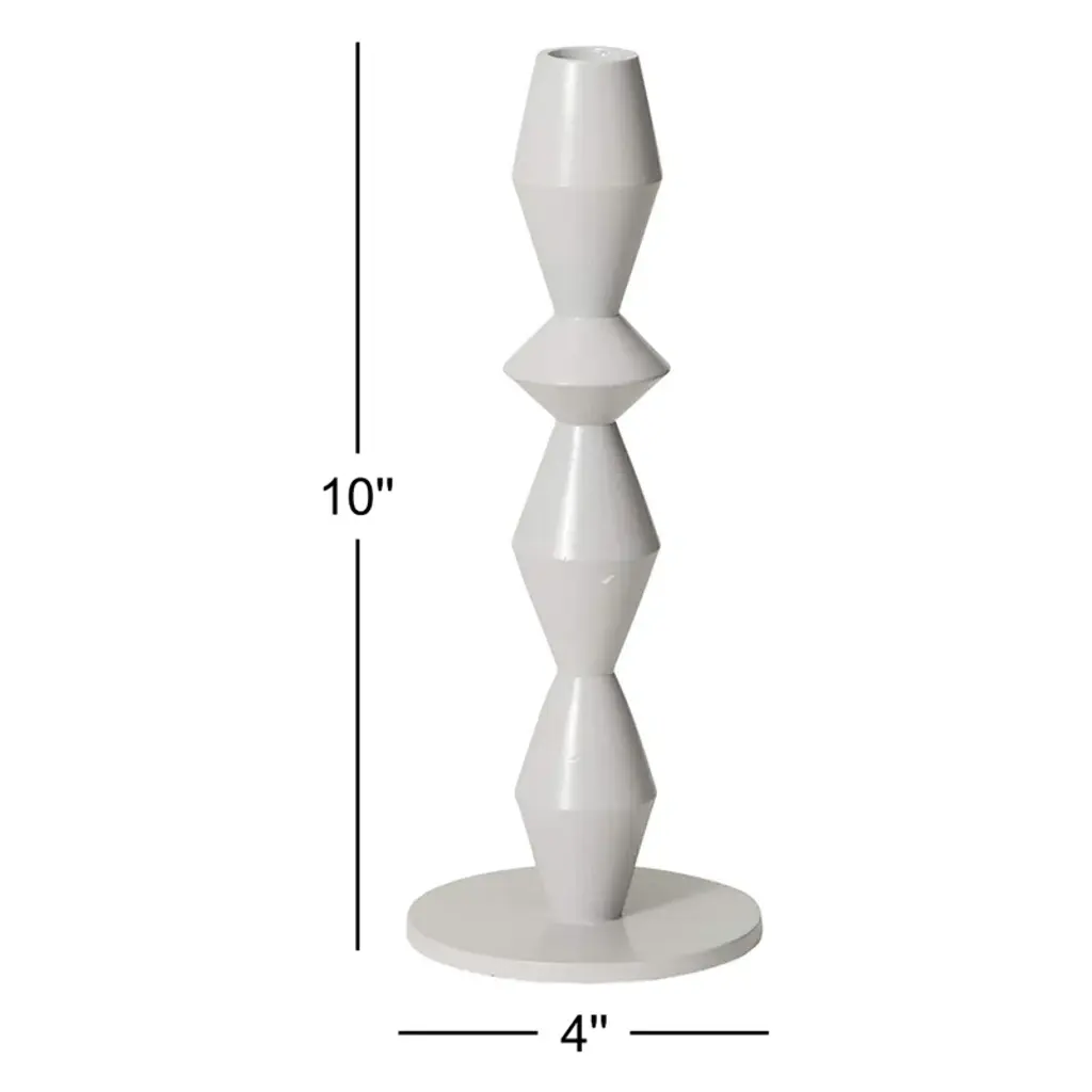 Angular and elegant, this candlestick brings a bold sculptural accent to your mantle or tablescape. A modern finish in glossy gray metal contrasts with a stacked silhouette that evokes handmade ceramic pieces. It accommodates most taper candles; add something in a vivid hue to dial up the drama.