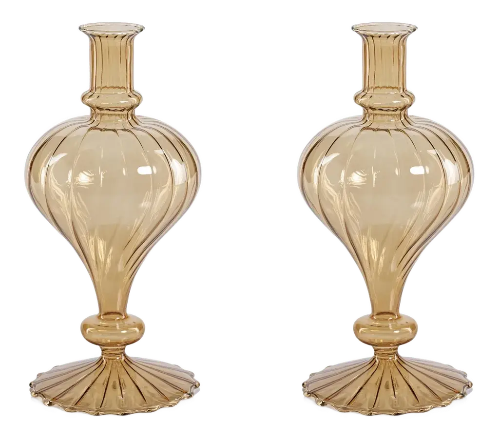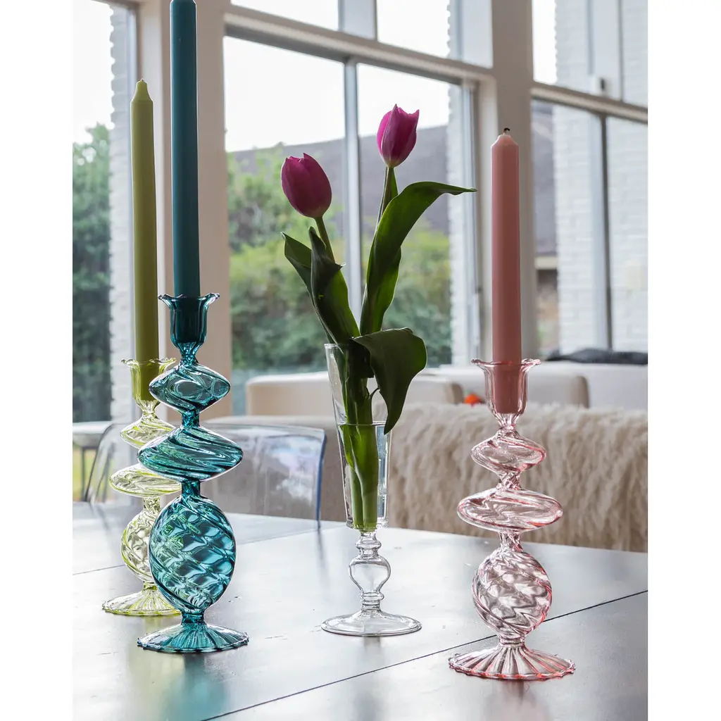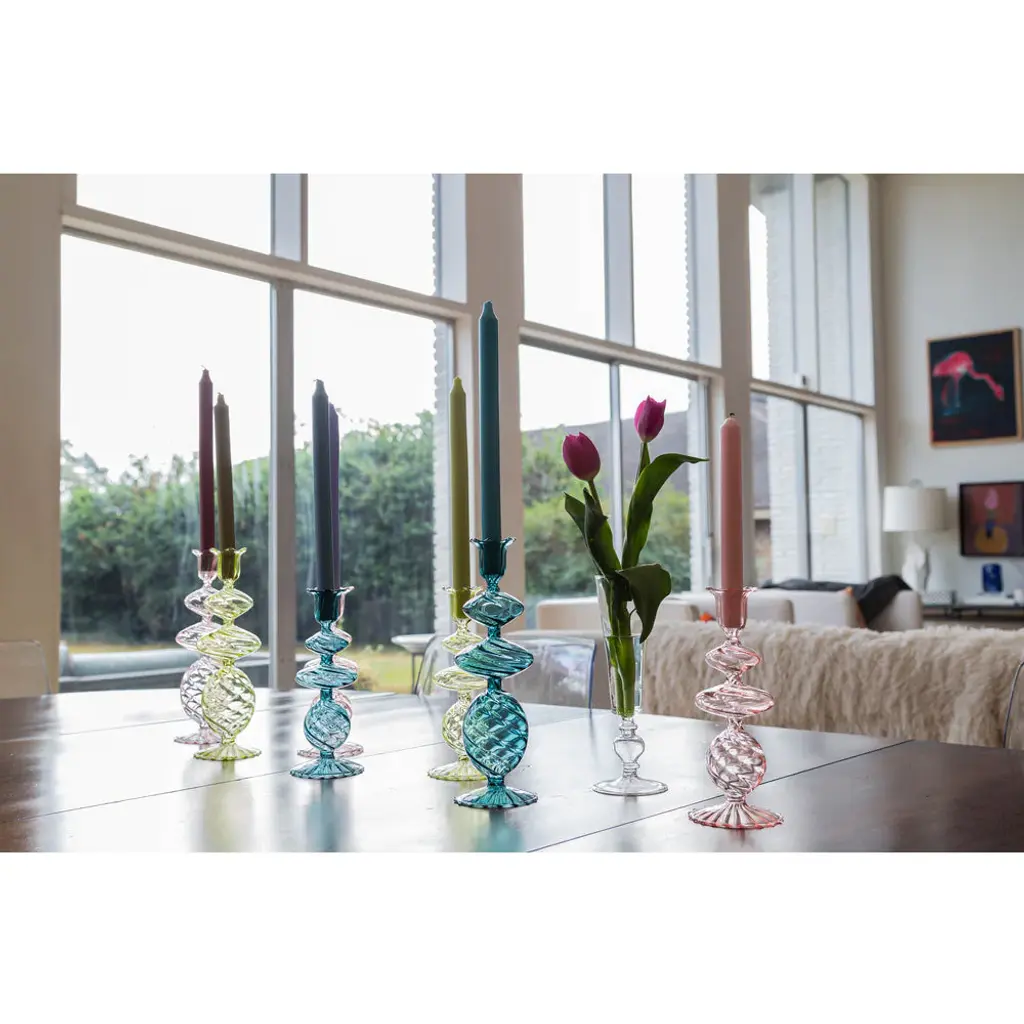 Like a twirling ballerina, this gorgeous pink taper candlestick shimmers as it rises. The transparency of the glass adds to the beauty of this retro-inspired candle holder.