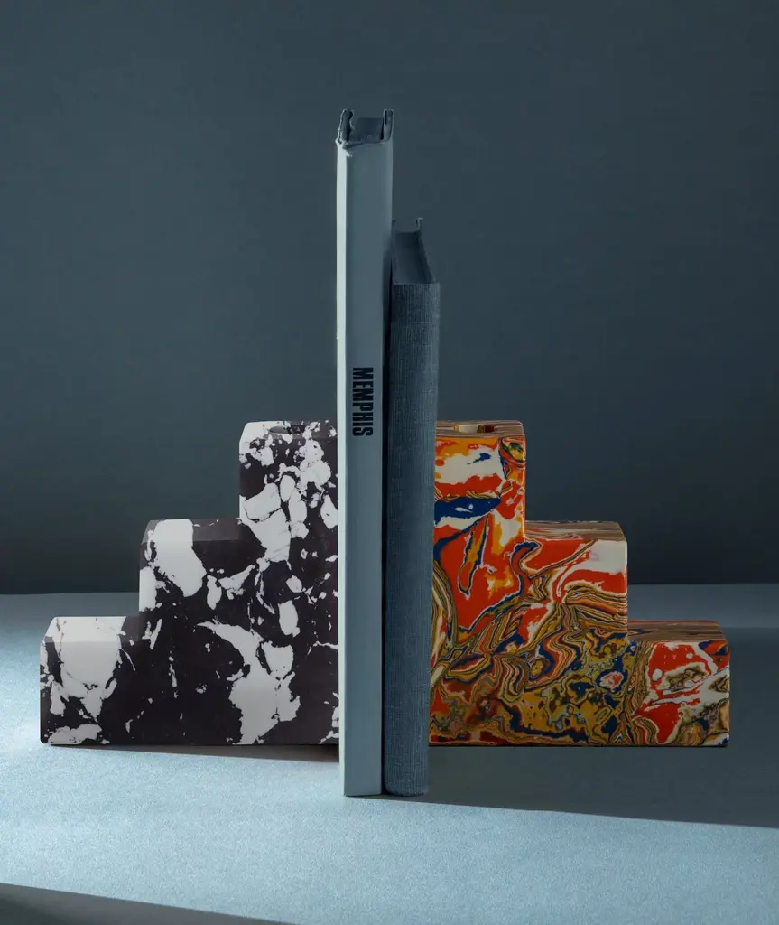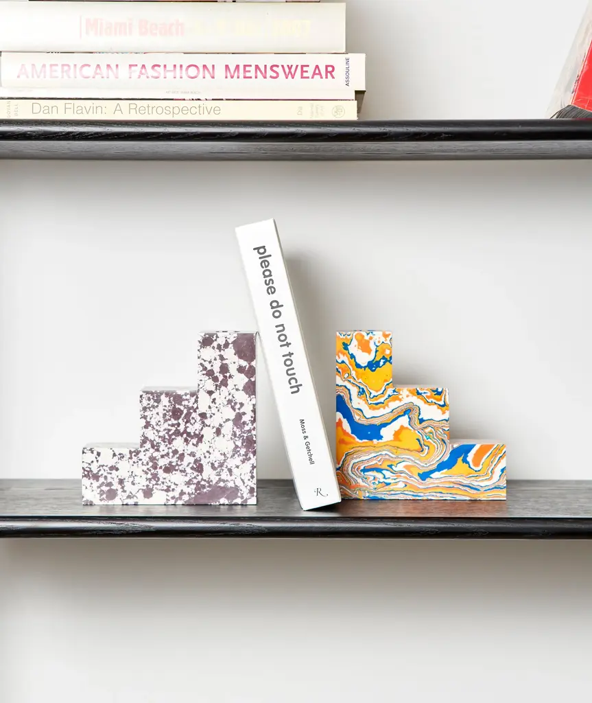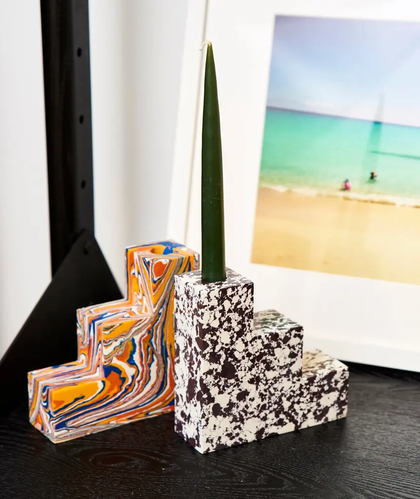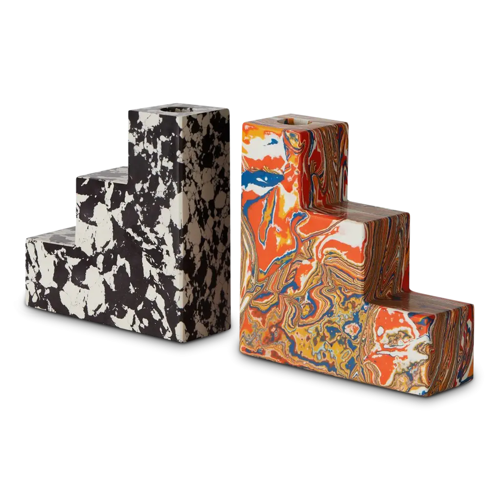 Swirl is a series of geometric forms stacked upon one another to create multi-dimensional, functional sculptures. The unique process involves recycling the powdered residue from the marble industry, mixed with pigment and resin to create blocks of material that can then be sawn, sliced and turned on a lathe. Substantial in weight, smooth in texture and bold in pattern, Swirl will inject a fresh pop of sensibility into any setting.