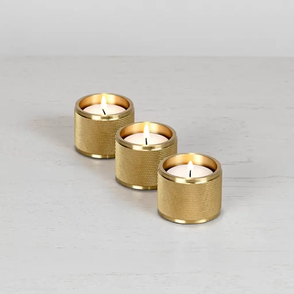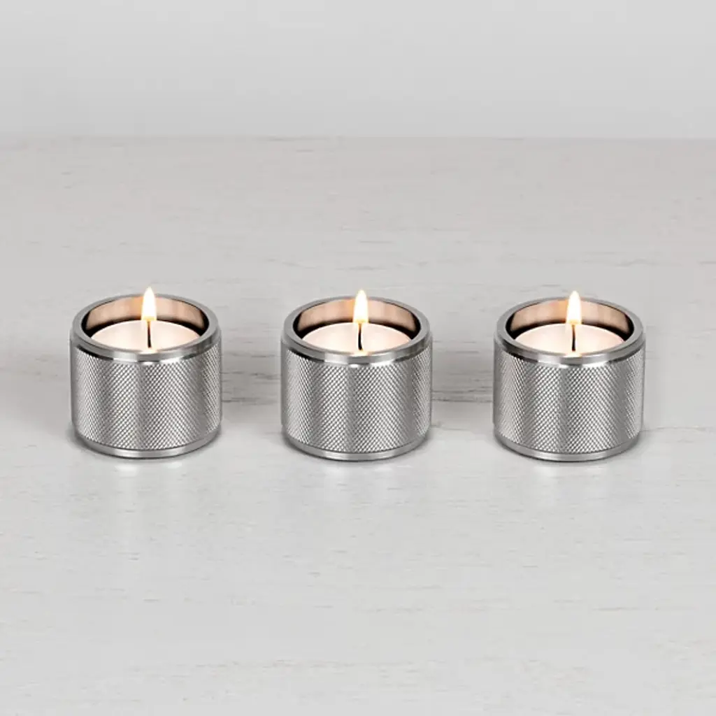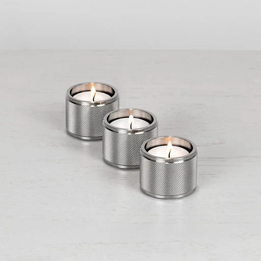 The Tealight Candle Holder Set of 3 from Buster + Punch adds contemporary flair to your space. Cylindrically designed for placement upon flat surfaces, each holder features a diamond-cut, cross-bound design for a subtle industrial edge. Carefully crafted from solid metal, these modern candle holders bring geometric style to tealight displays.