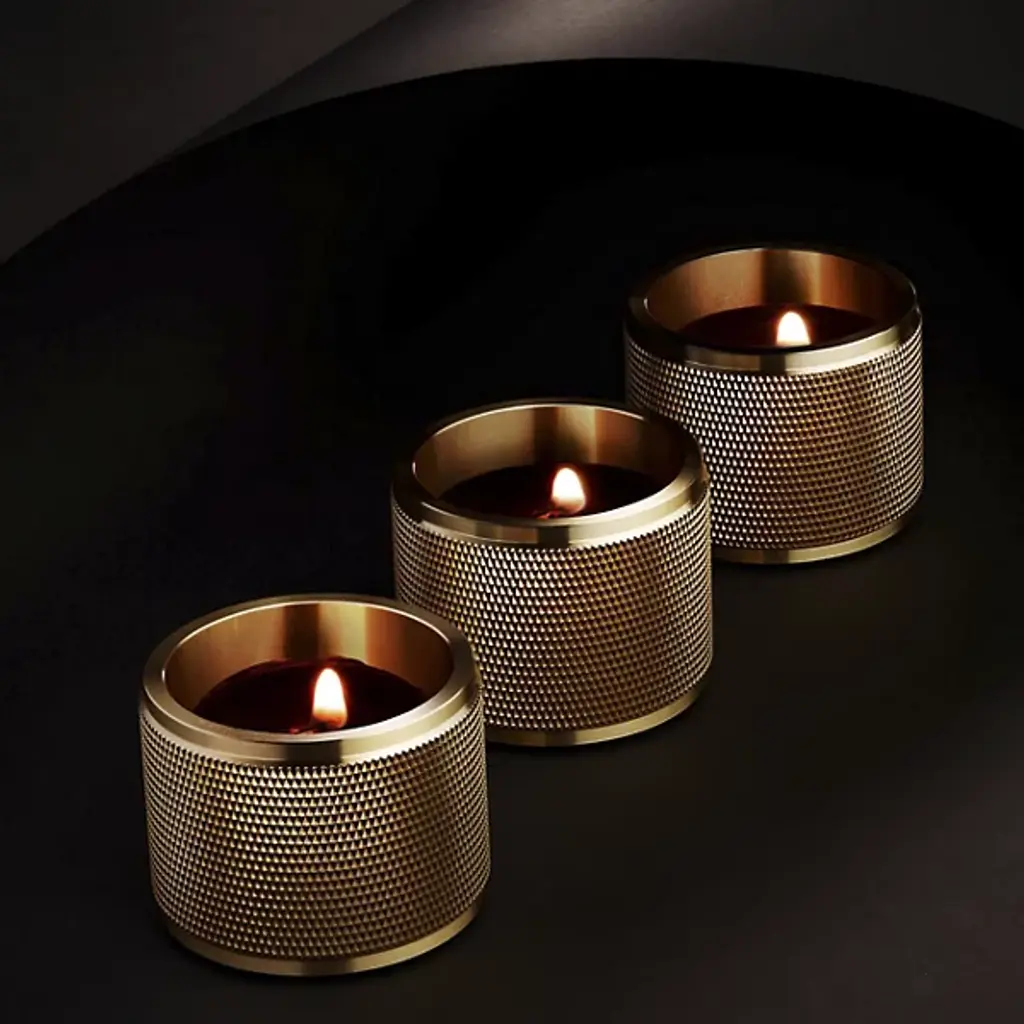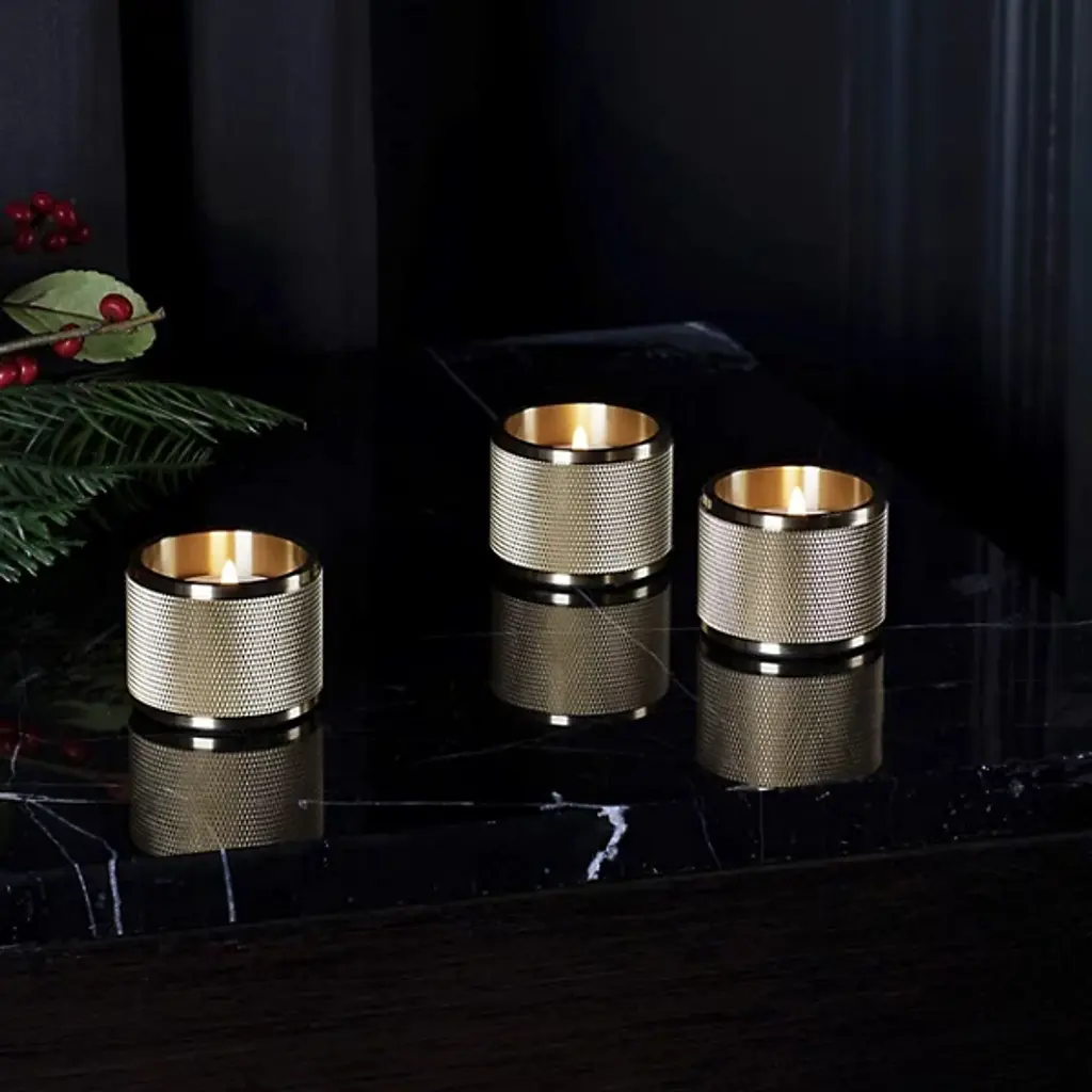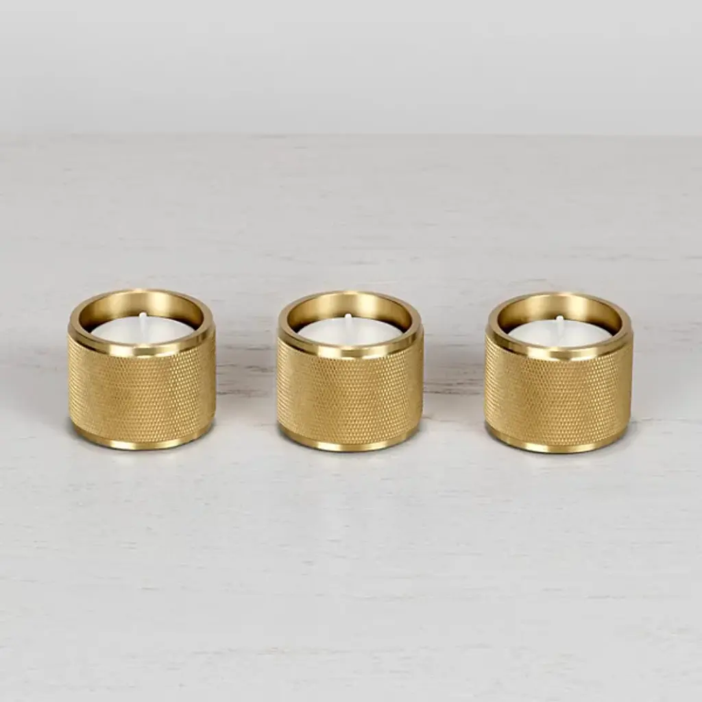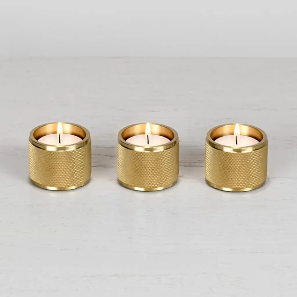 The Tealight Candle Holder Set of 3 from Buster + Punch adds contemporary flair to your space. Cylindrically designed for placement upon flat surfaces, each holder features a diamond-cut, cross-bound design for a subtle industrial edge. Carefully crafted from solid metal, these modern candle holders bring geometric style to tealight displays.