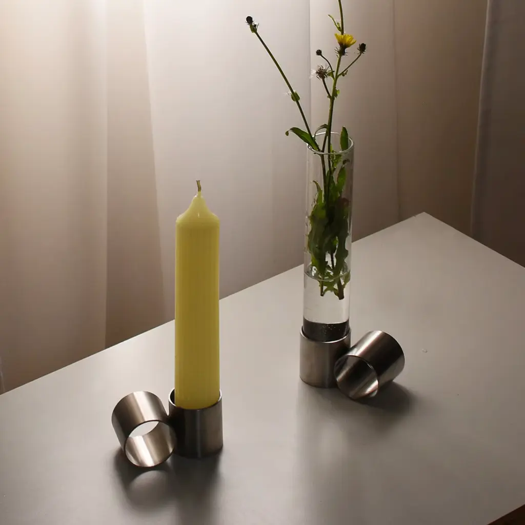 Candleholder and flower holder in a single object, Tempio del Tempo was conceived as a small altar for the home, created through the union of simple and symbolic shapes that fit together without connections and remain divisible: two stainless steel rings joined together with invisible welding, a pure soy wax candle with a cotton wick and a borosilicate glass vase. The removable closure of the steel base is made of recycled rubber and creates the ideal support to accommodate candles. Candle and glass vase included.