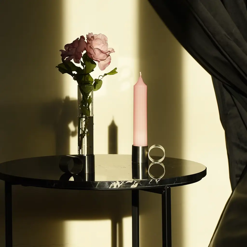 Candleholder and flower holder in a single object, Tempio del Tempo was conceived as a small altar for the home, created through the union of simple and symbolic shapes that fit together without connections and remain divisible: two stainless steel rings joined together with invisible welding, a pure soy wax candle with a cotton wick and a borosilicate glass vase. The removable closure of the steel base is made of recycled rubber and creates the ideal support to accommodate candles. Candle and glass vase included.
