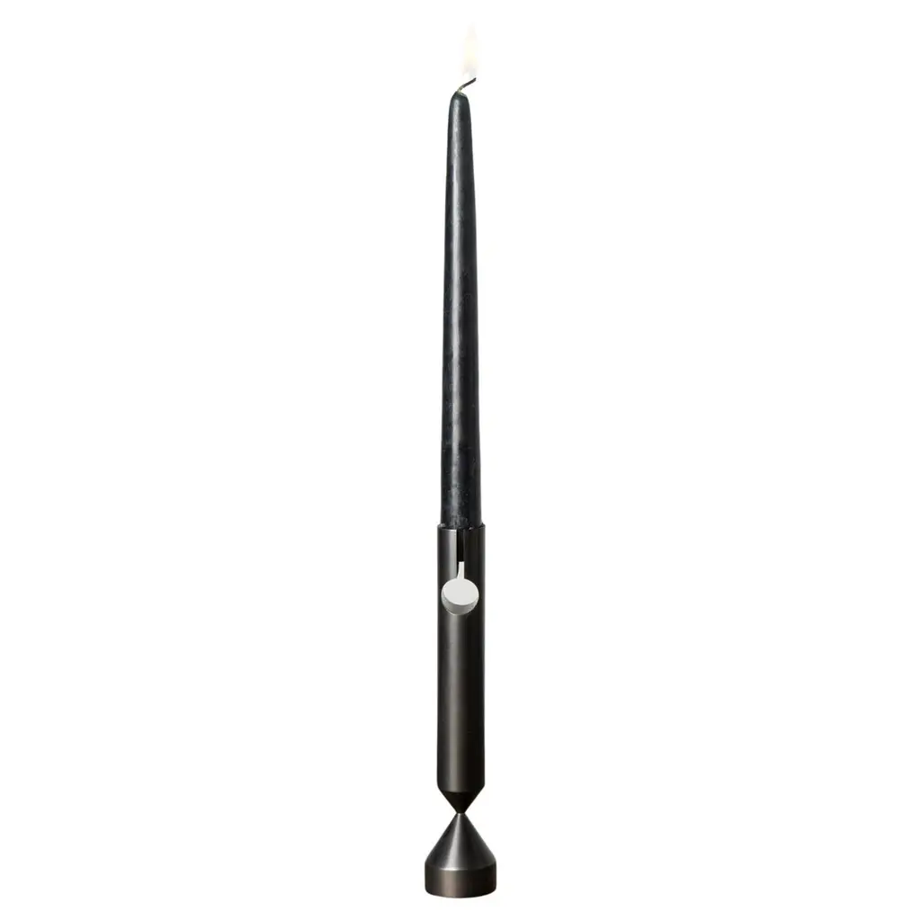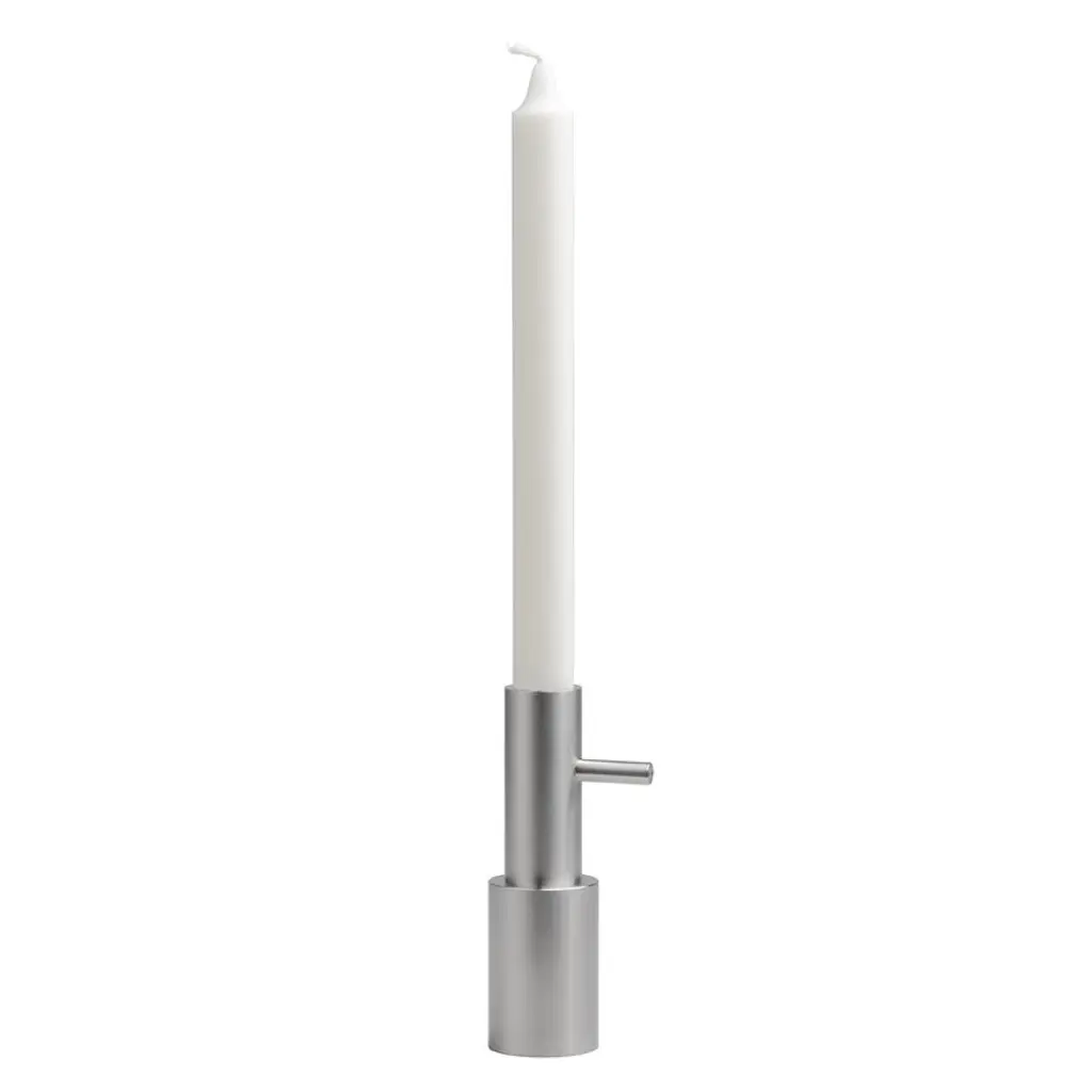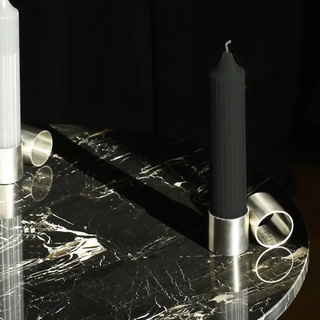Candleholder and flower holder in a single object, Tempio del Tempo was conceived as a small altar for the home, created through the union of simple and symbolic shapes that fit together without connections and remain divisible: two stainless steel rings joined together with invisible welding, a pure soy wax candle with a cotton wick and a borosilicate glass vase. The removable closure of the steel base is made of recycled rubber and creates the ideal support to accommodate candles. Candle and glass vase included.
