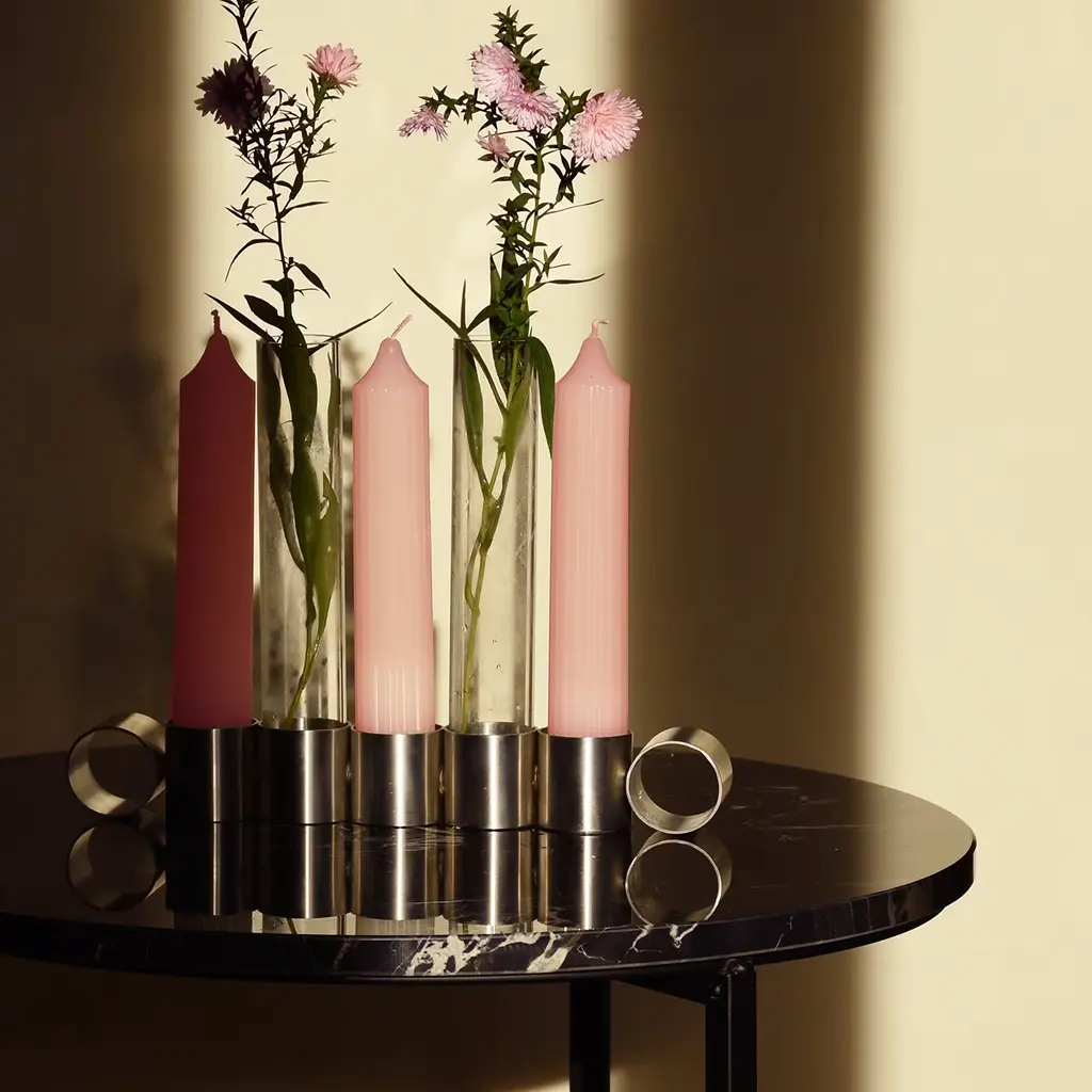 Candleholder and flower holder in a single object, Tempio del Tempo was conceived as a small altar for the home, created through the union of simple and symbolic shapes that fit together without connections and remain divisible: two stainless steel rings joined together with invisible welding, a pure soy wax candle with a cotton wick and a borosilicate glass vase. The removable closure of the steel base is made of recycled rubber and creates the ideal support to accommodate candles. Candles and glass vases included.
