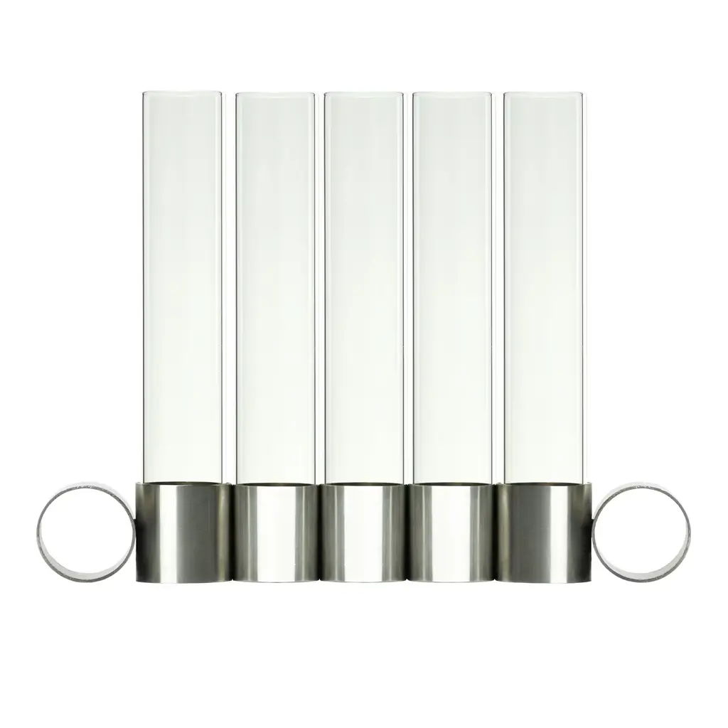 Candleholder and flower holder in a single object, Tempio del Tempo was conceived as a small altar for the home, created through the union of simple and symbolic shapes that fit together without connections and remain divisible: two stainless steel rings joined together with invisible welding, a pure soy wax candle with a cotton wick and a borosilicate glass vase. The removable closure of the steel base is made of recycled rubber and creates the ideal support to accommodate candles. Candles and glass vases included.