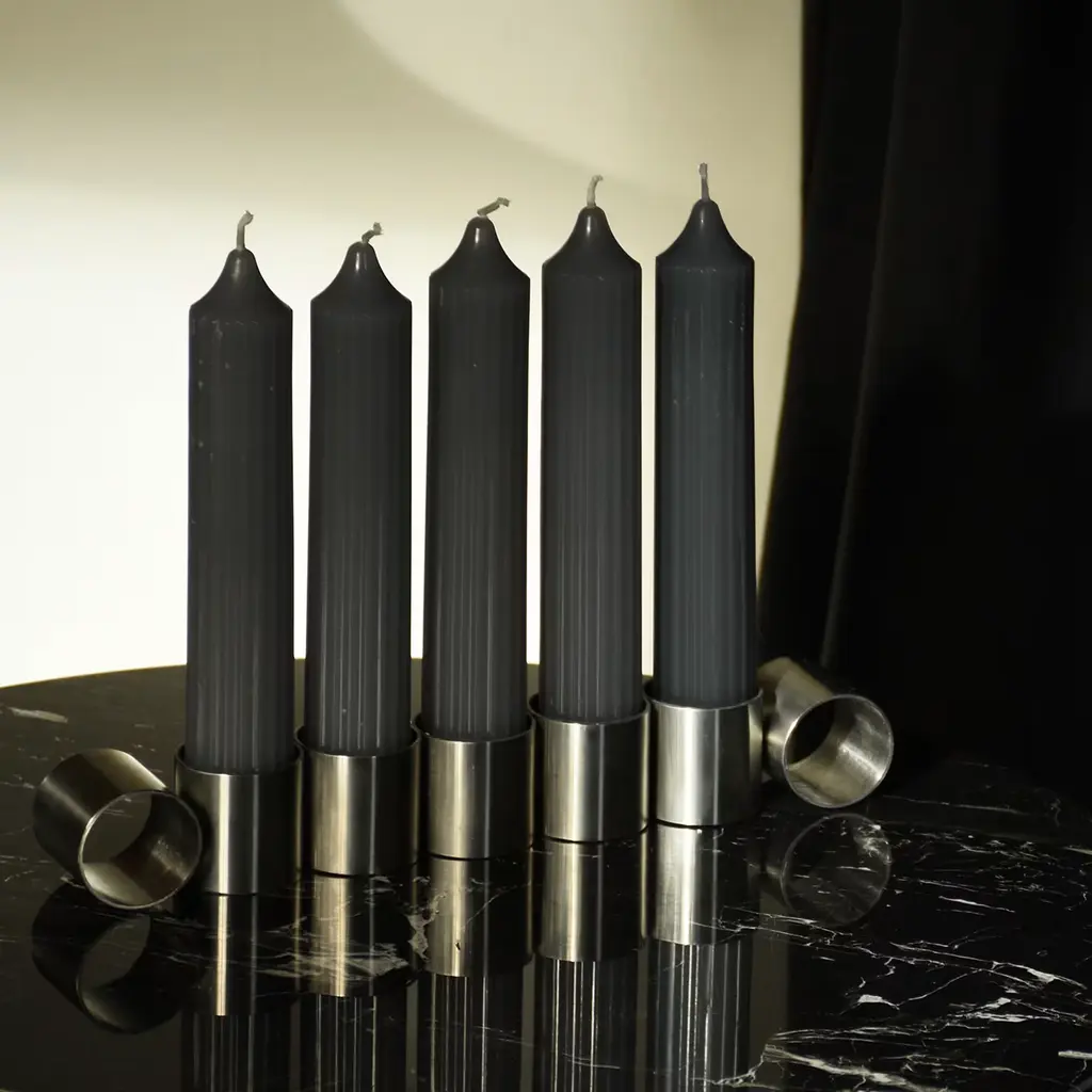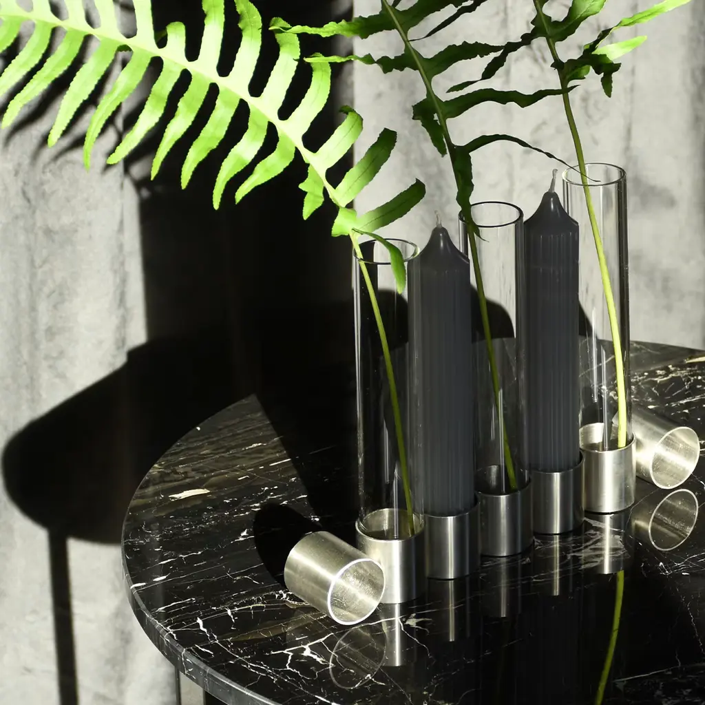 Candleholder and flower holder in a single object, Tempio del Tempo was conceived as a small altar for the home, created through the union of simple and symbolic shapes that fit together without connections and remain divisible: two stainless steel rings joined together with invisible welding, a pure soy wax candle with a cotton wick and a borosilicate glass vase. The removable closure of the steel base is made of recycled rubber and creates the ideal support to accommodate candles. Candles and glass vases included.