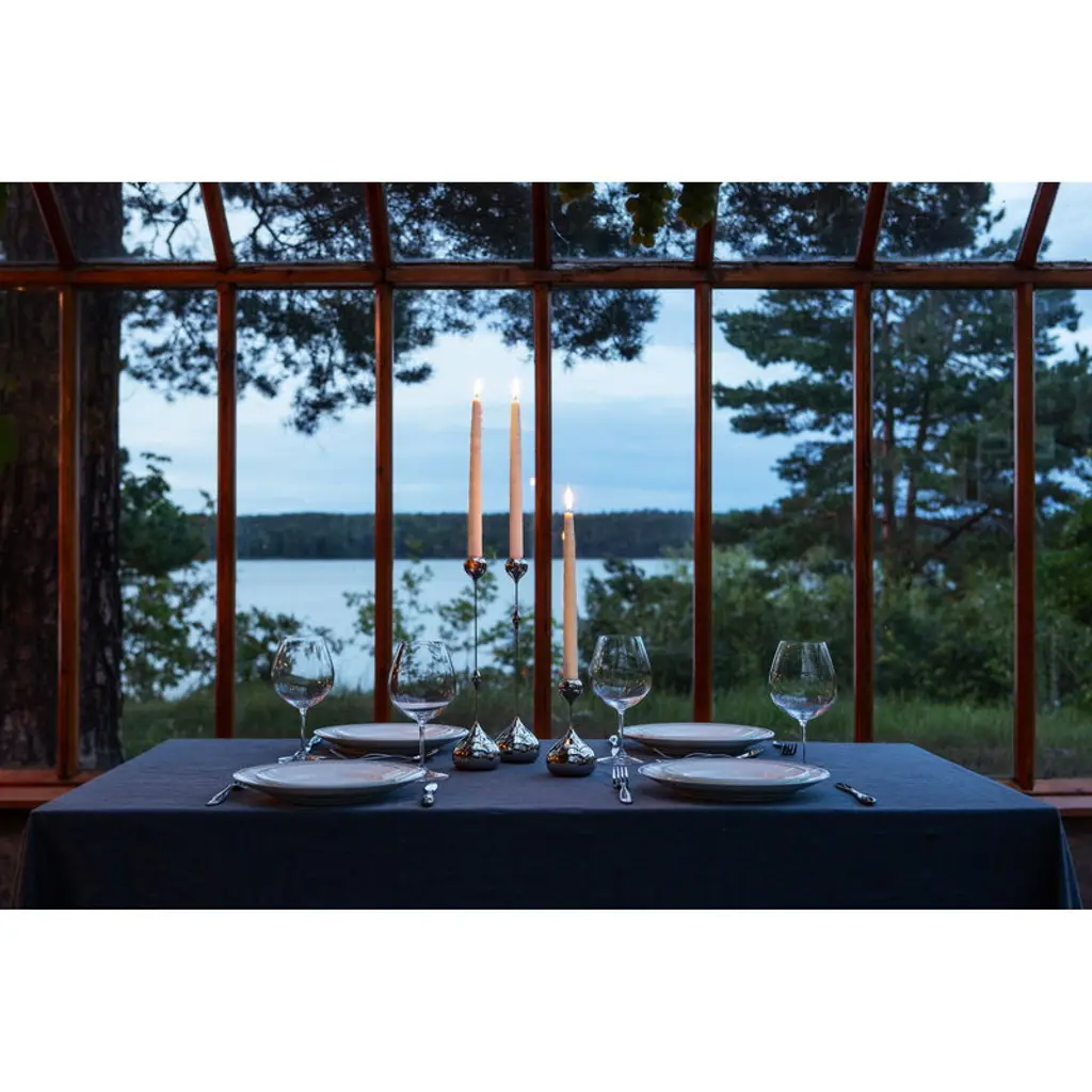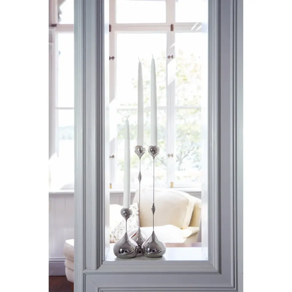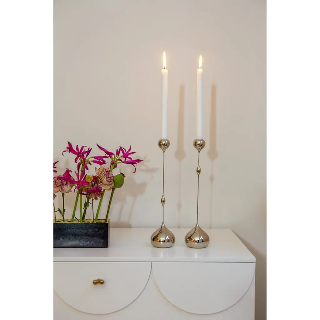 Klong’s Tender candleholder’s design is characterized by its delicate silhouette contrasted by plump drop-like details. Designer Charlotte von der Lancken drew inspiration for Tender’s slender look from the sculptures of Swiss artist Alberto Giacometti. The designer was also inspired by how backlight can fade the outline of an object. The brass, nickel-plated candleholders are available in several sizes with the decorative drops placed at different heights.