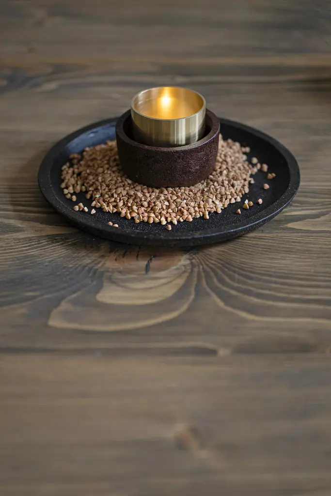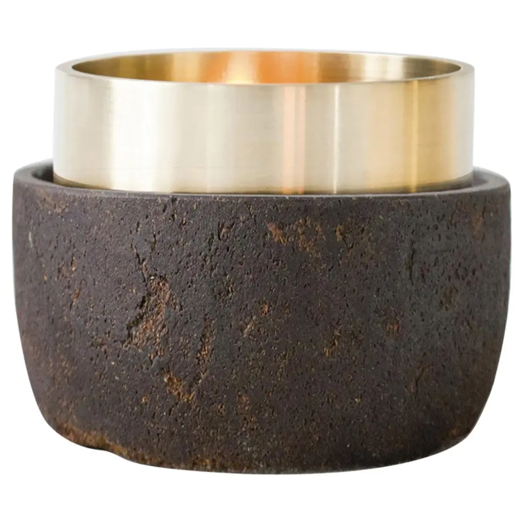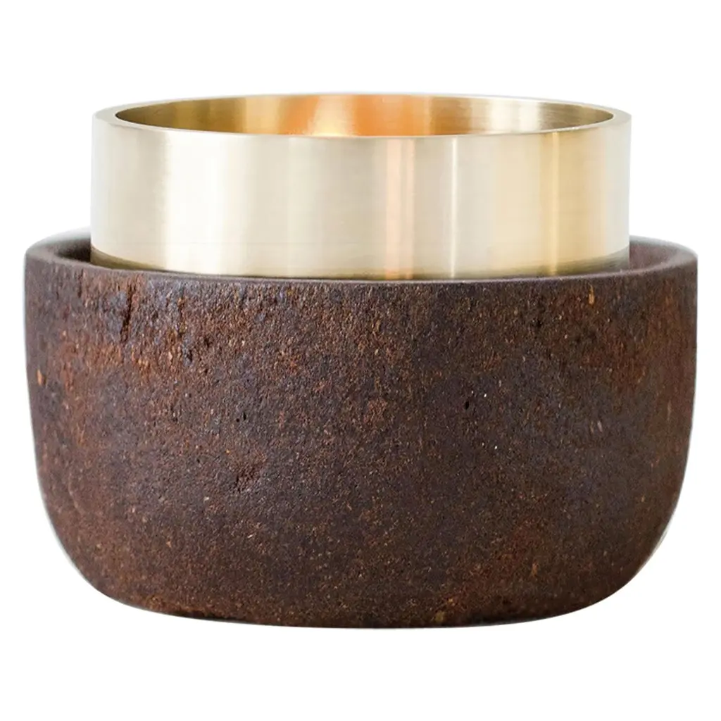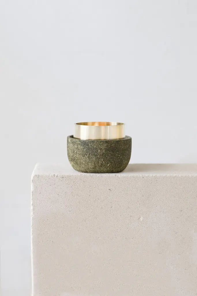Tree Leaves candle holder by Evelina Kudabaite StudioHandmadeMaterials: tree leaves, brassDimensions: H 55 mm x D 65 mmColour: greenNotes: for dry useSince 2015, product designer Evelina Kudabaite keeps on developing and making GIRIA objects. Designer firsthomeware collection launched in 2015 during the London Design Festival. Everyday objects are used, seen, touched. Tactility and expressive qualities of materials have important communicative value, so the design process requires for intense research on textures. GIRIA is a homeware collection balancing between tactility, shape and color. The project is aimed to pass the sensations of the forest through material, to establish a connection between the user and the object. This collection is result of an experimental process by which it was meant to show how materials, which are destined to become waste - tree bark and leaves - can be transformed into sustainable design through the traditional crafts.It is a research on the alternative and unconventional ways to shape wood, which reminds of the culinary process. During the research a recipe of a unique material that consists of harmless organic substances has been found. No two items in GIRIA are the same: each is made by hand and the bark dust of diferent kinds of trees gives a unique texture, varying in colour and roughness of a surface. It takes time to make a piece in GIRIA, that is considering preparation of the bark, drying time - from days, to weeks - and variability of the process. All the items are coated with mix of foodsafe oils to make it more durable. The materials in GIRIA may change slowly over time and the collection distinguishes itself from mass production, making the products as individual as their owners.Evelina is a product designer based in Vilnius, Lithuania. Her research usually starts from materials and processes which transform them into design objects. She is fascinated by the narrative hidden in a product and by its power of carrying knowledge, memories and emotions in a more concrete and tactile way. When designing something, she wants to tell a story, to create a reaction of wonder and curiosity in the people who are going to interact with the object.
