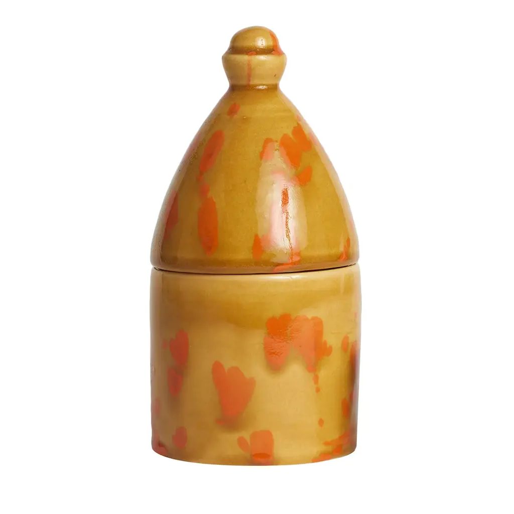 Inspired by the traditional houses found in Apulia's Itria Valley, this stupendous candle holder boasts a sinuous, distinctive silhouette handmade of caramel and orange-painted ceramic. Completed with a handmade soy wax candle with an orange and caramel scent. Available in other colors, this piece comes in recycled cardboard and a rough linen box.