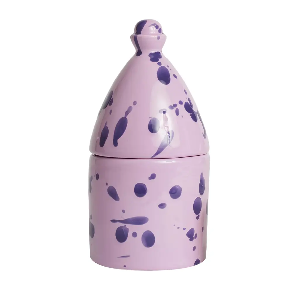A magnificent tribute to the Itria Valley the southern region of Apulia, this candle holder features an elegant yet simple design inspired by the distinctive shape of a trullo, a typical local house. Handmade of lilac and purple painted ceramic, it is completed with a handmade soy wax candle boasting a lavender and iris scent combining warming and enveloping qualities. Available in other colors, this piece comes in recycled cardboard and a rough linen box.