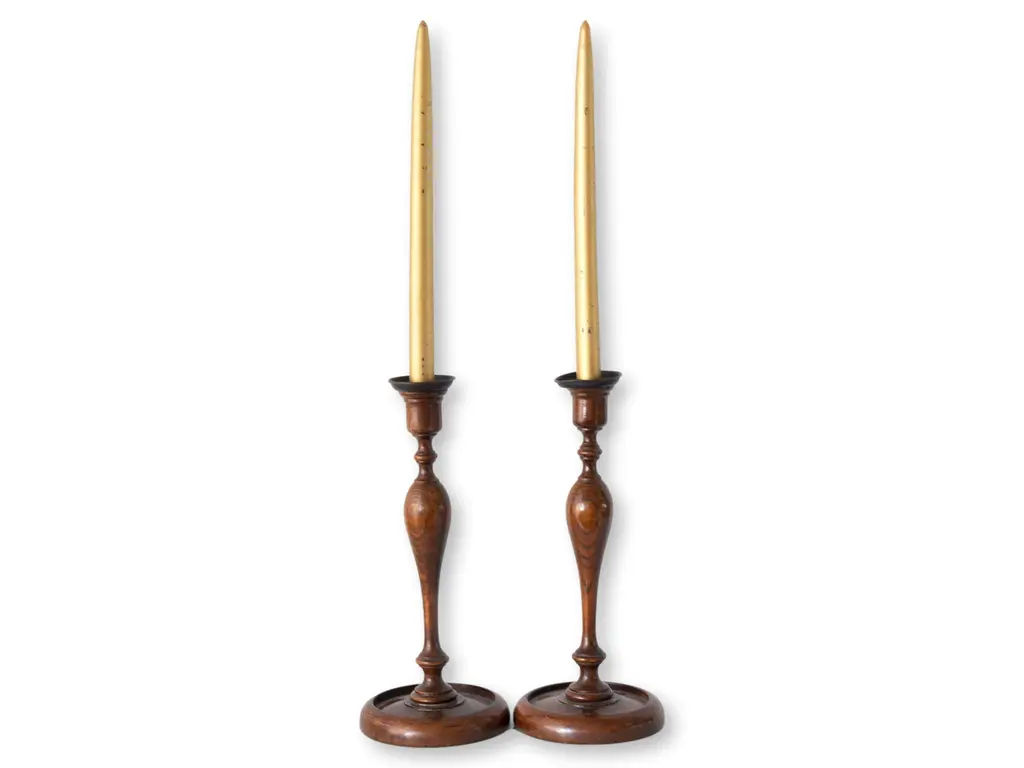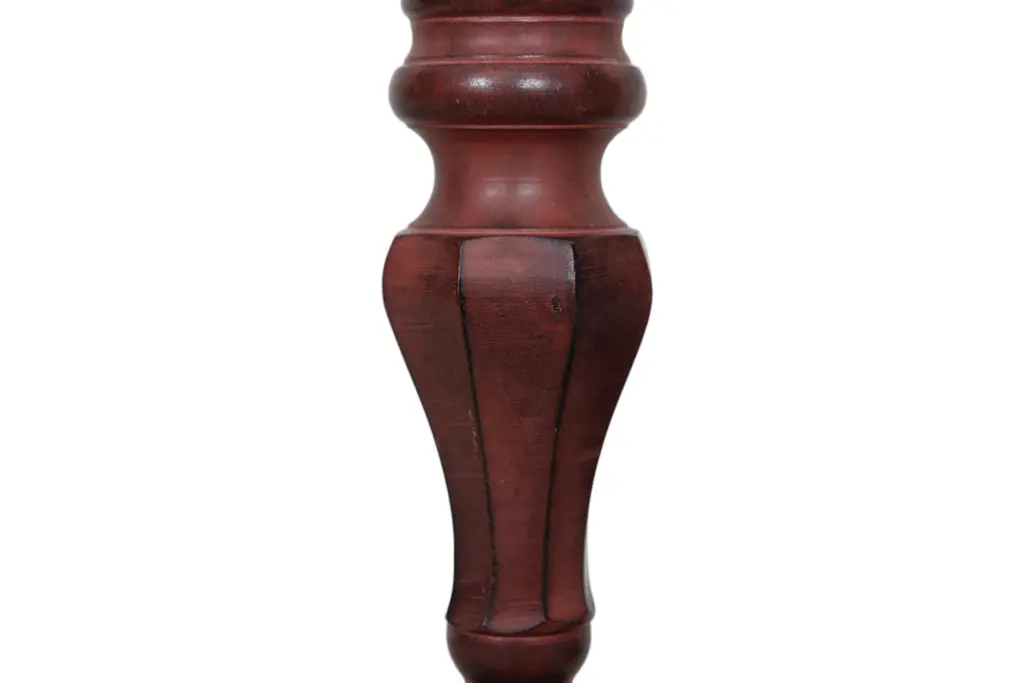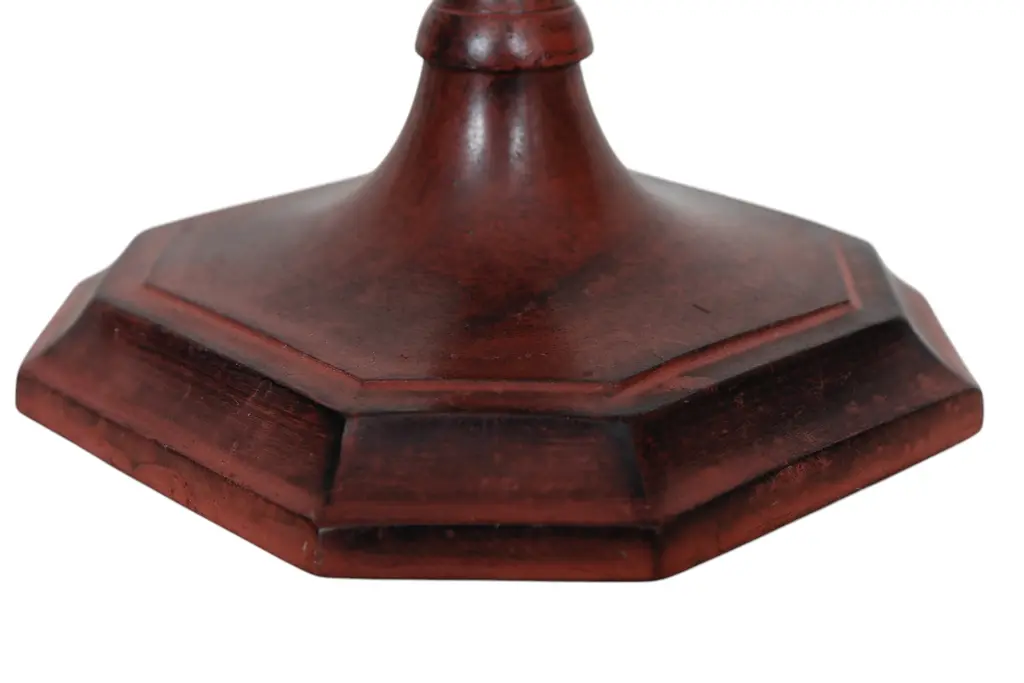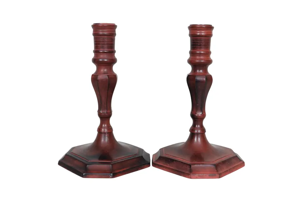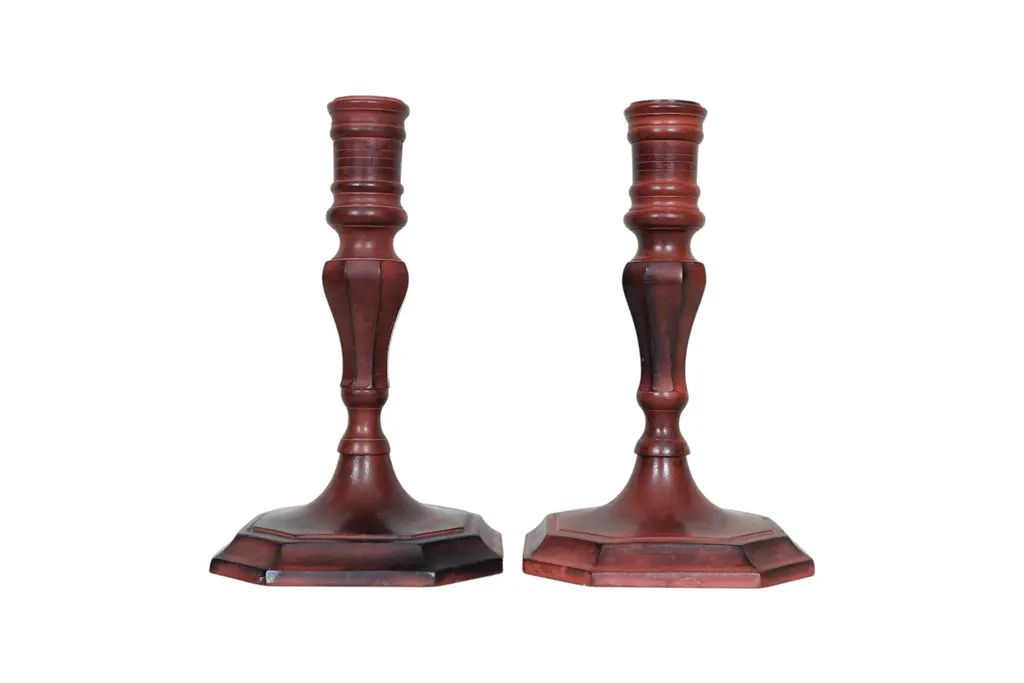 A pair of brass candlestick holders. Traditional turned candlestick holders with octagonal bases are colored with a red finish.