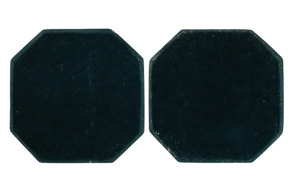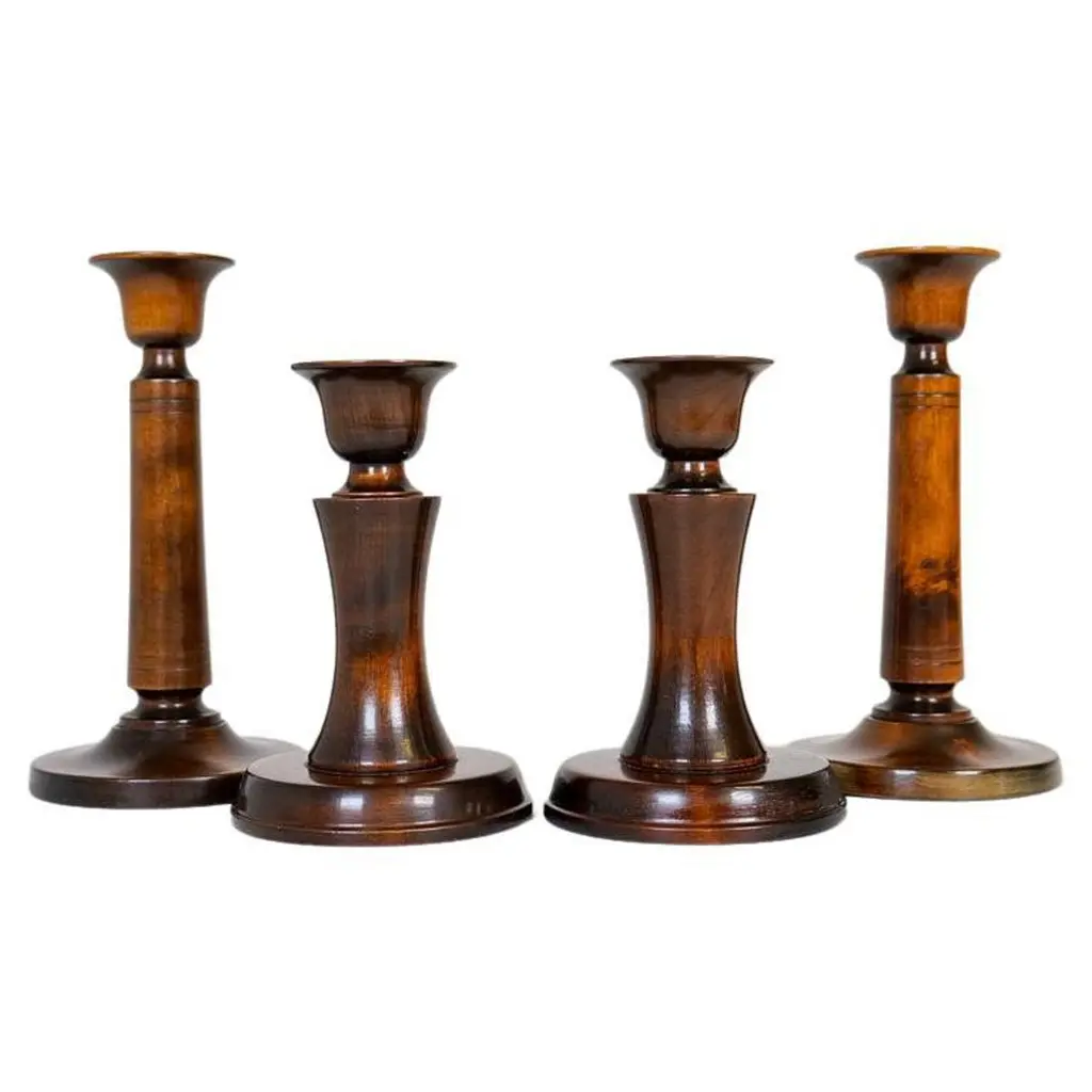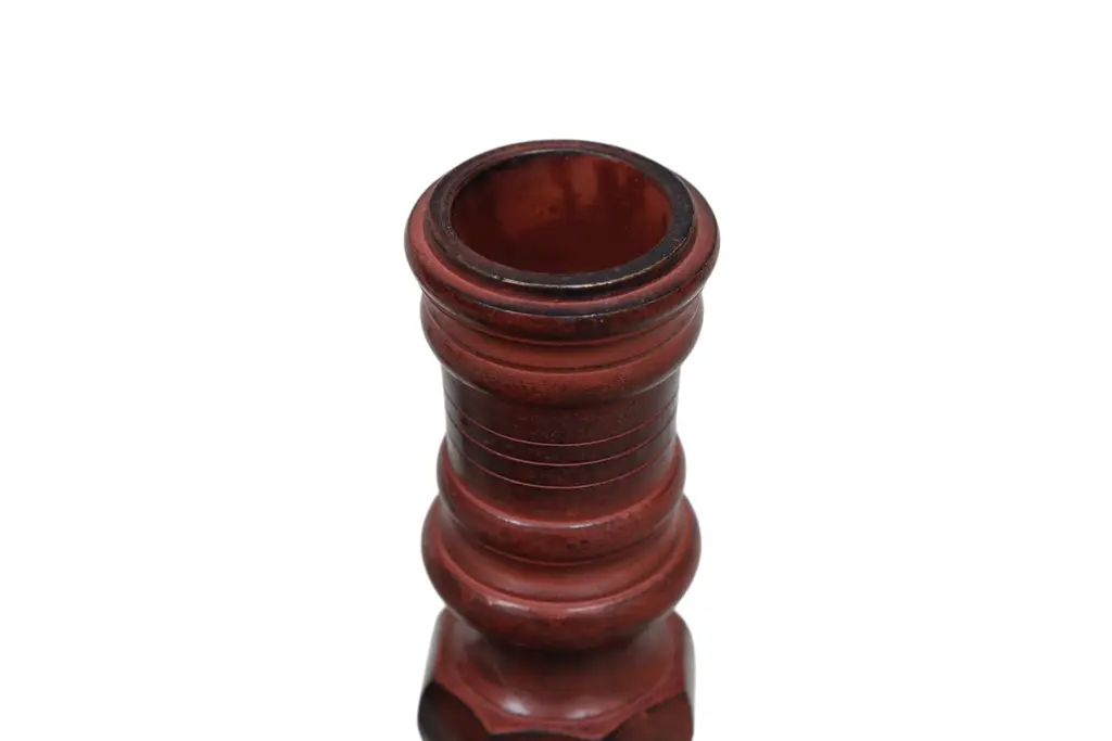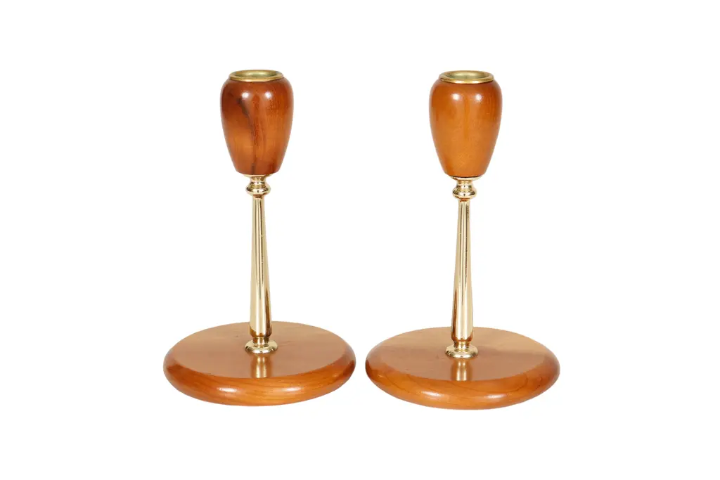 A pair of brass candlestick holders. Traditional turned candlestick holders with octagonal bases are colored with a red finish.