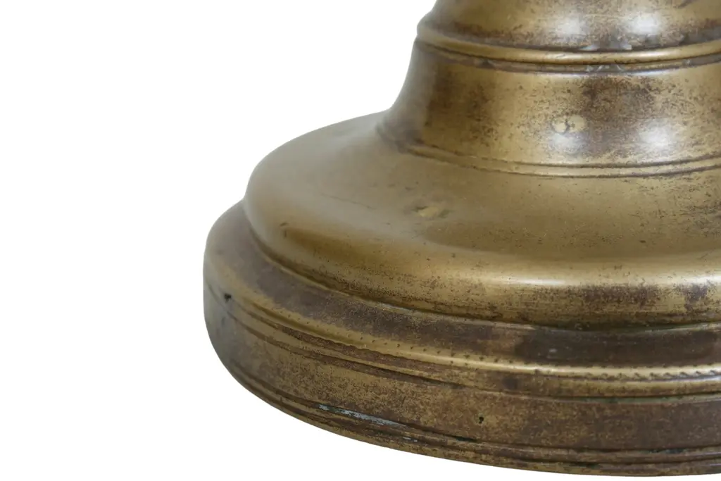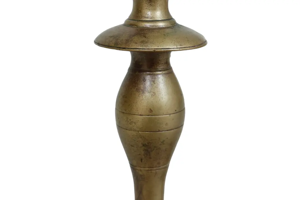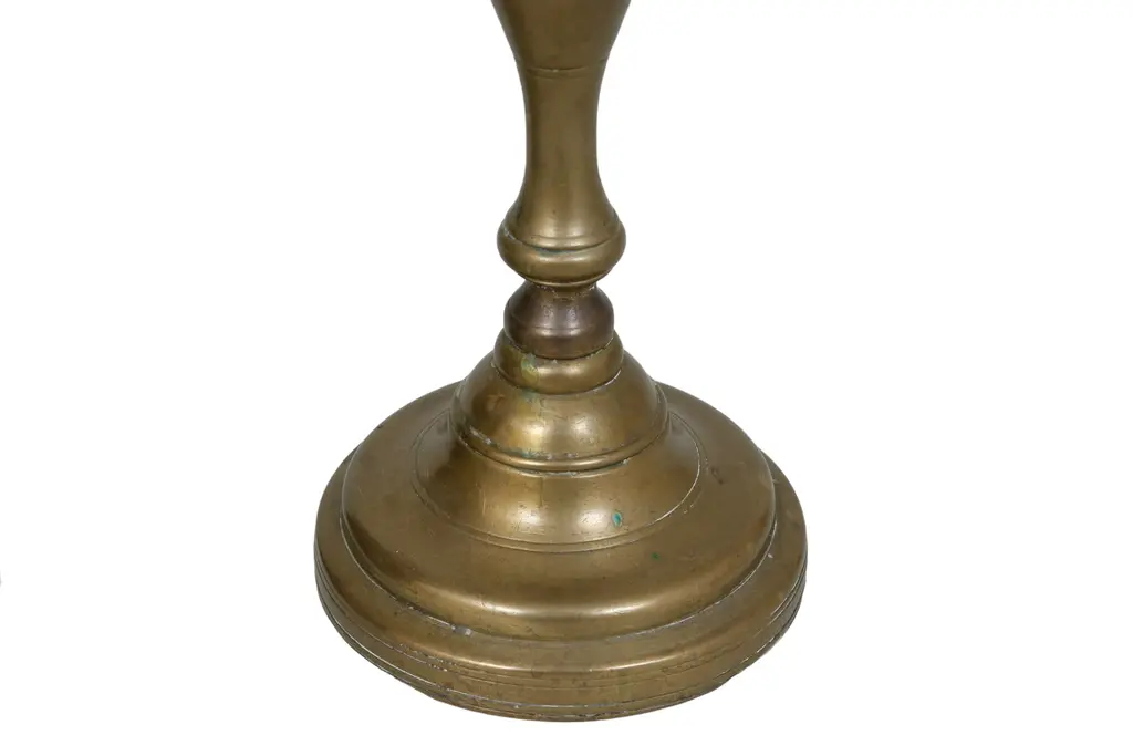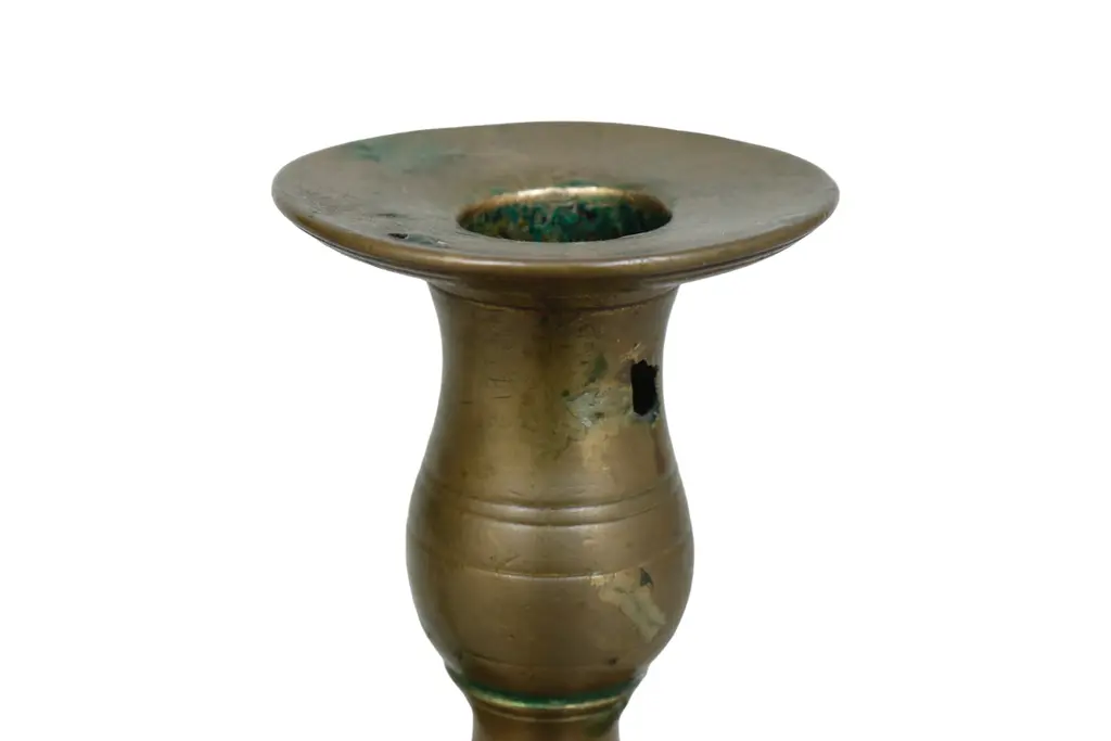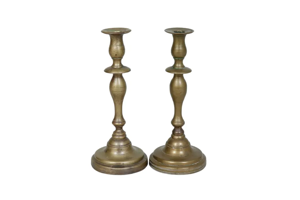 A pair of traditional turned candlestick holders in brass. Simple baluster columns are turned with sleek wax pans and shoulders above round bases. Dimensions per candlestick holder.