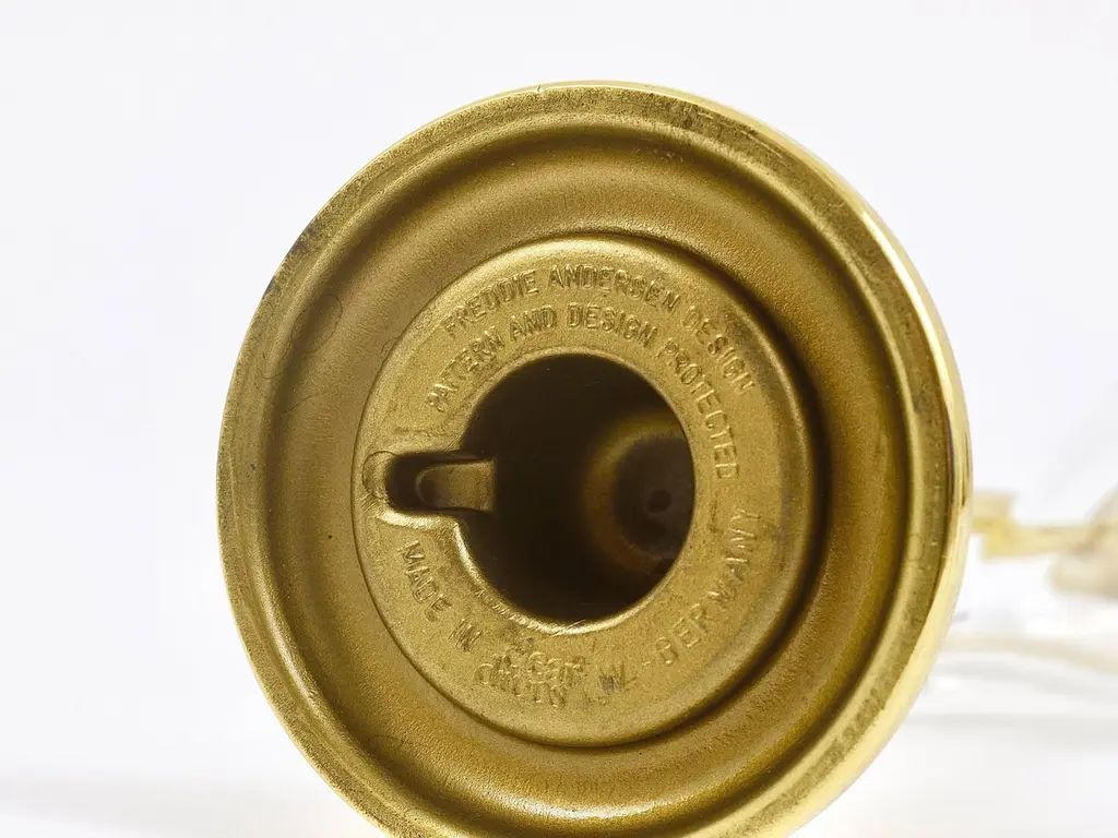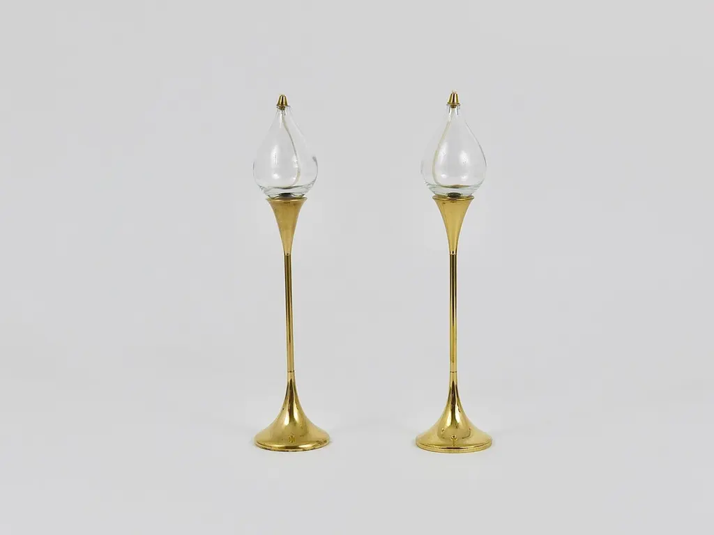 Two beautiful 14 in high modernist brass oil lamp candlesticks, designed by Freddie Andersen, made in Western Germany in the 1970s. In very good condition. Two candleholders are available, sold and priced per piece.