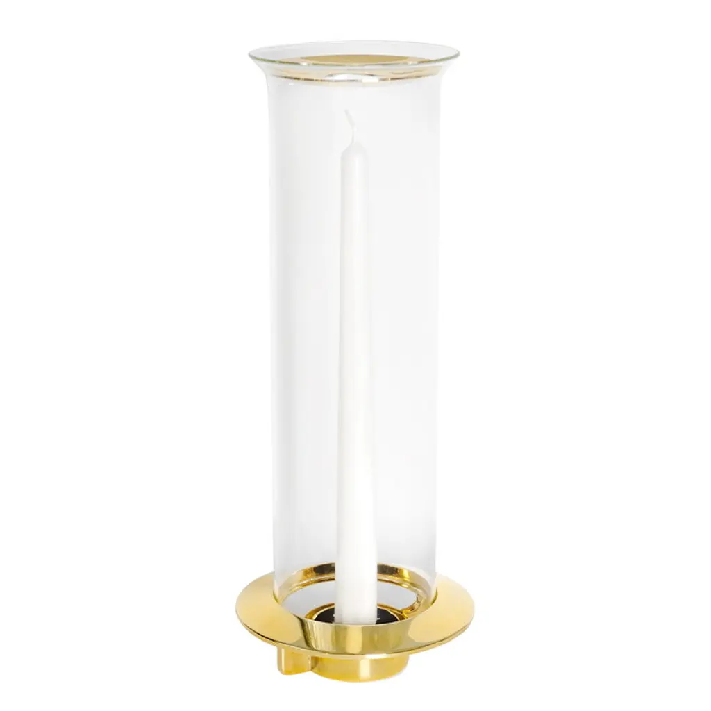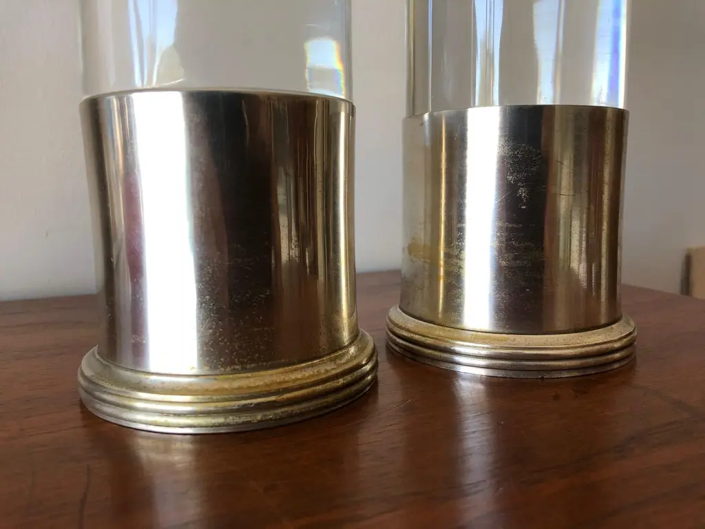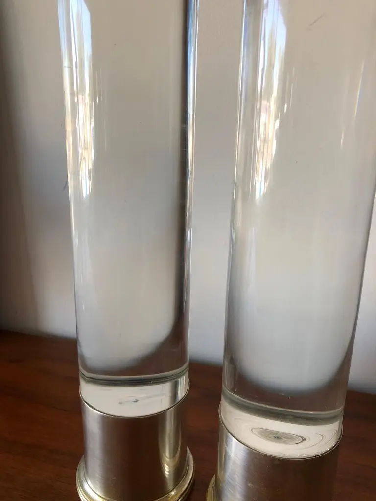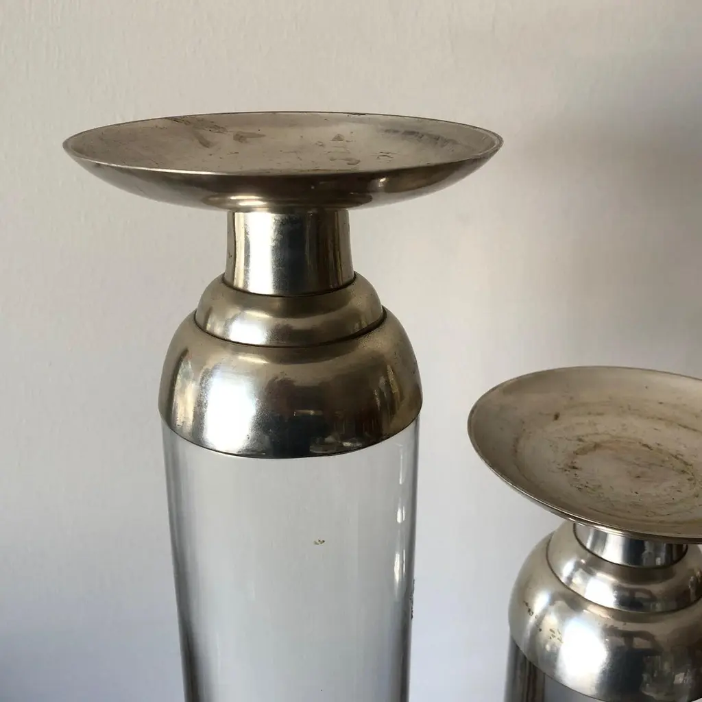 A pair of interesting Lucite candlesticks, heavy and very well made with nickeled brass elements.
