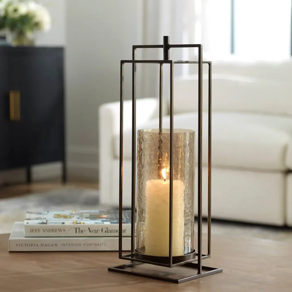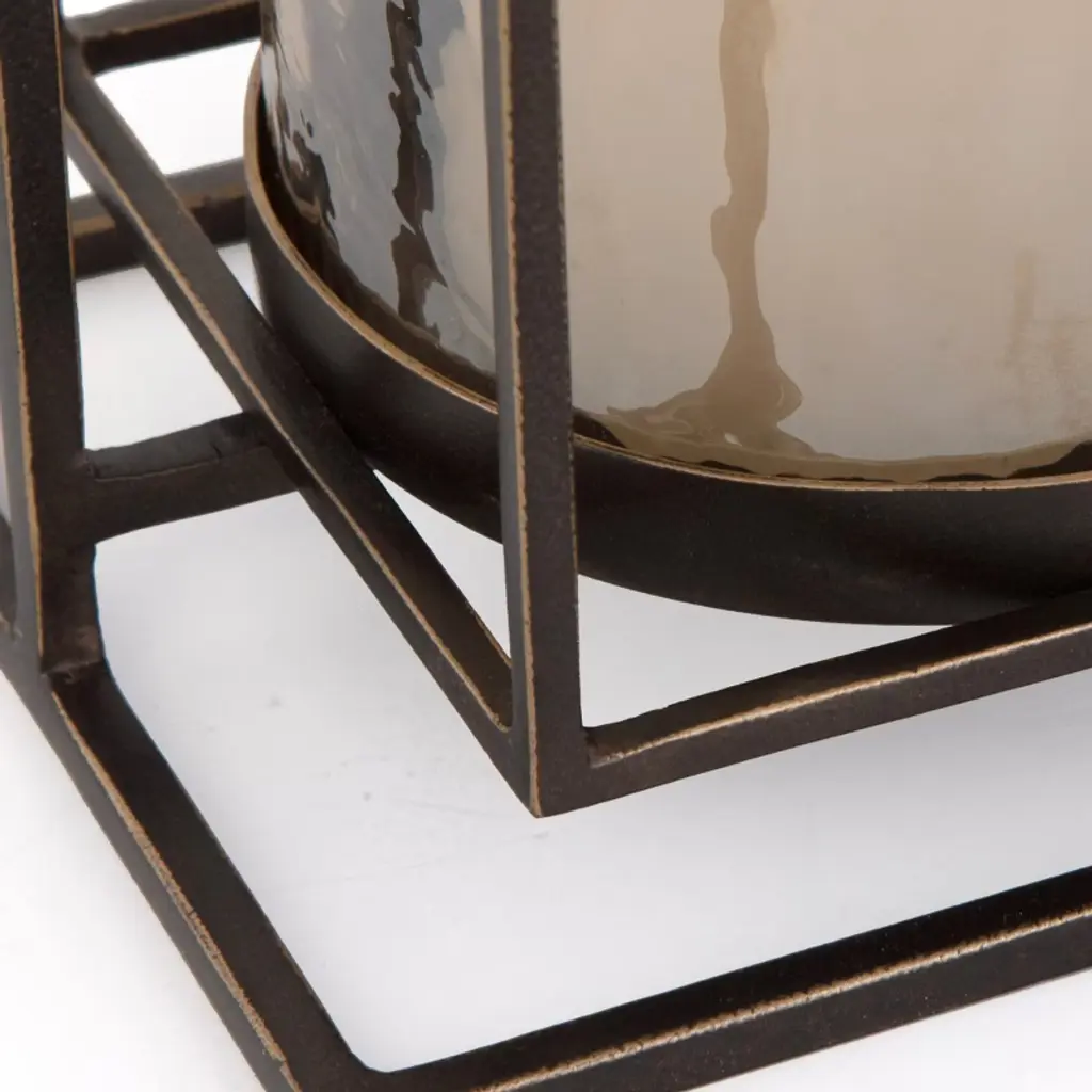 The Wenman Bronze Candleholder adds timeless elegance and warmth to any setting with its exquisite blend of textured glass and iron craftsmanship. Featuring a removable glass hurricane designed to hold a pillar candle, this lantern-style piece is finished in dark bronze with subtle gold rub-through details for a touch of vintage charm. Perfect for tabletops, mantels, or entryways, it provides a soft, ambient glow that enhances both traditional and modern décor. A white 3" x 5" candle is included for instant illumination. Key Features: Iron stand finished in dark bronze with gold rub-through highlights. Removable textured glass hurricane accommodates a pillar candle. Includes a white 3" x 5" candle for immediate use. Adds a warm, inviting glow to indoor or covered outdoor spaces. Dimensions: 7 W x 19 H x 6 D (in); Weight: 7 lbs.