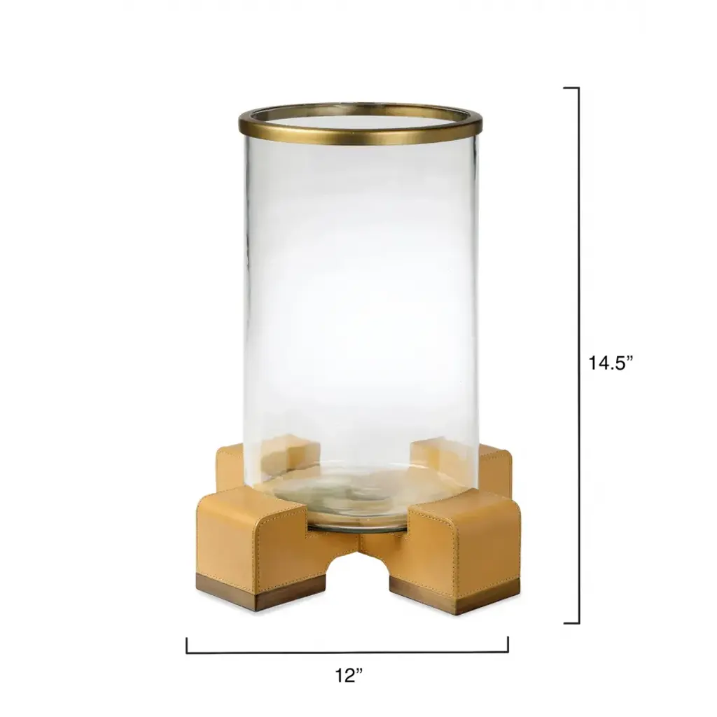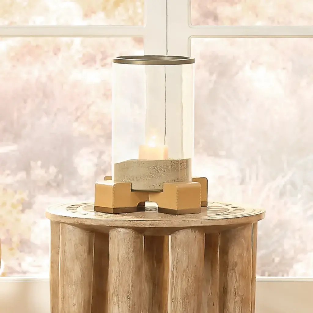 Edgy, elemental materials balance the softness of a candle’s glow in this contemporary take on a classic hurricane. A thick cylinder of hand-blown glass protects the candle’s fragile flame and is itself supported by a base covered in rich and creamy leather. The top and bottom of the piece are banded in contrasting metal. Customize the look with your own candle; try an ivory pillar for a monochromatic effect, or use a colored candle to coordinate with your décor.